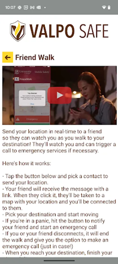 - Friend Walk: Send your location to a friend through email or SMS on your device. Once the friend accepts the Friend Walk request, the user picks their destination and their friend tracks their location in real-time; they can keep an eye on them to make sure they make it safely to their destination.