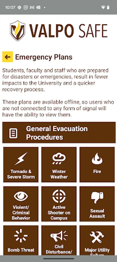 - Emergency Plans: Campus emergency documentation that can prepare you for disasters or emergencies. This can be accessed even when users aren’t connected to Wi-Fi or cellular data.