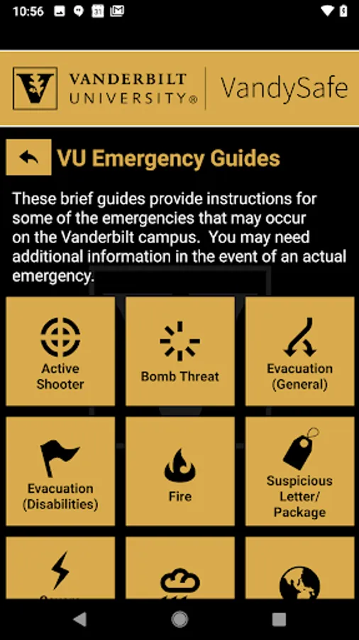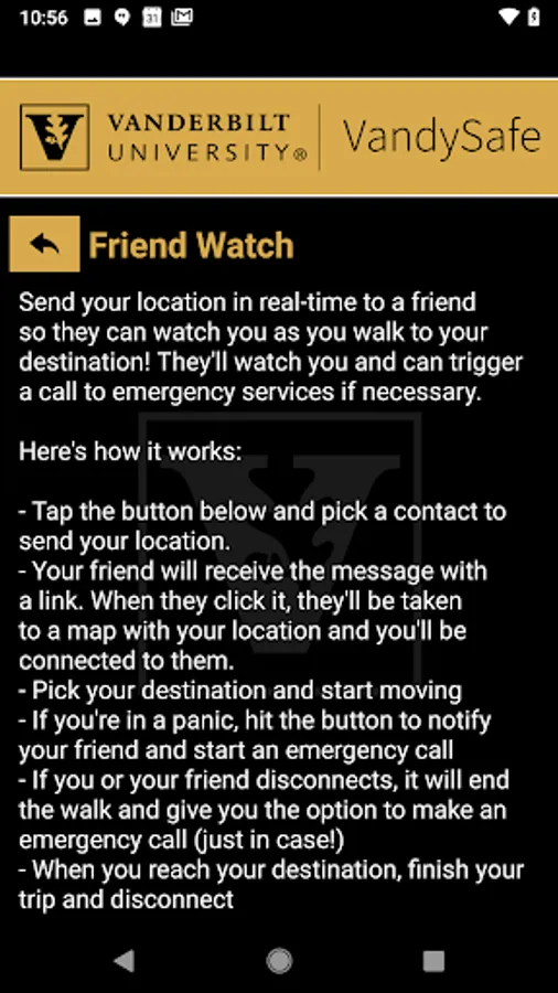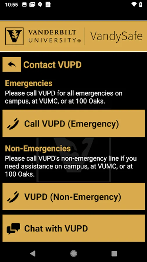 - Chat with Security: Communicate live with safety staff at Vanderbilt University via chat.
