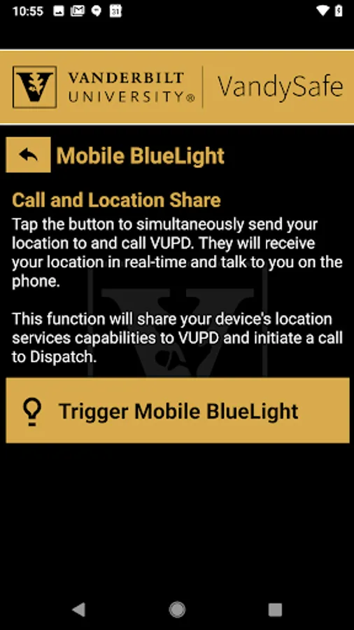 - Mobile Bluelight: Send your location to Vanderbilt University security in real-time in case of a crisis