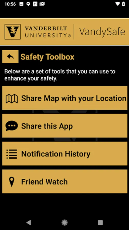 VandySafe is the official safety app of Vanderbilt University. It is the only app that integrates with Vanderbilt University's safety and security systems. Emergency Preparedness has worked to develop a unique app that provides students, faculty and staff with added safety on the Vanderbilt University campus. The app will send you important safety alerts and provide instant access to campus safety resources.