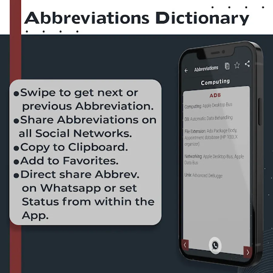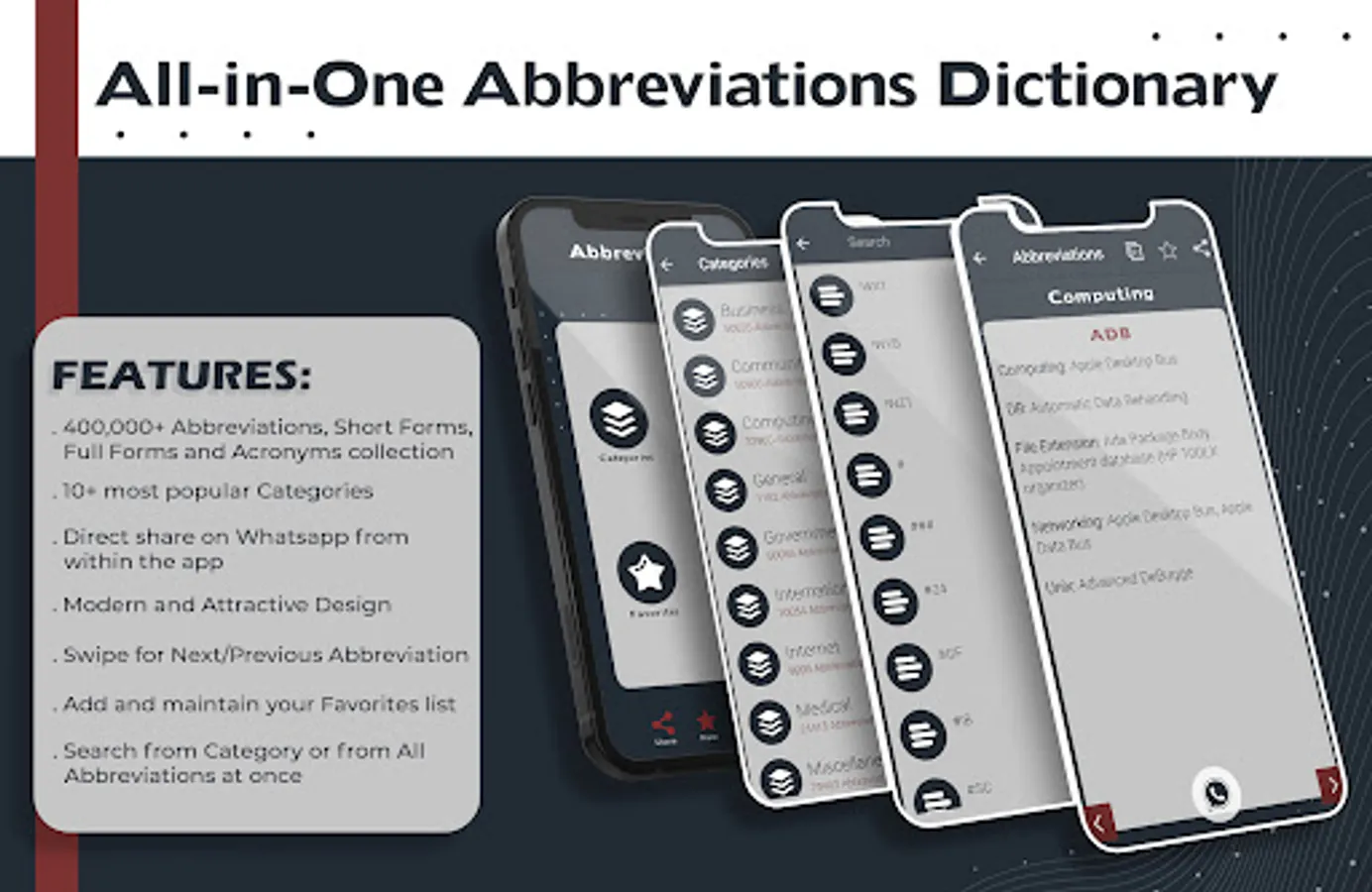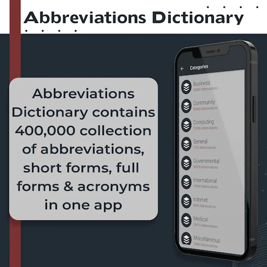 Abbreviation Dictionary is an all in one fullform dictionary app for you to help you in your everyday routine in learning new abbreviations everytime. Abbreviations Dictionary is the best app to share daily short forms, fullforms and acronyms with your friends and family from 400,000+ precised abbreviations arranged in 10+ popular categories related to different fields of education.