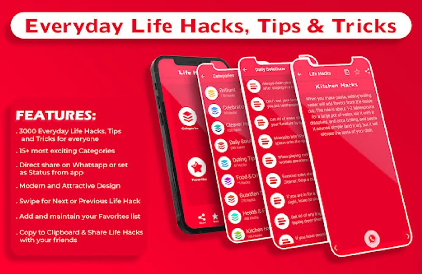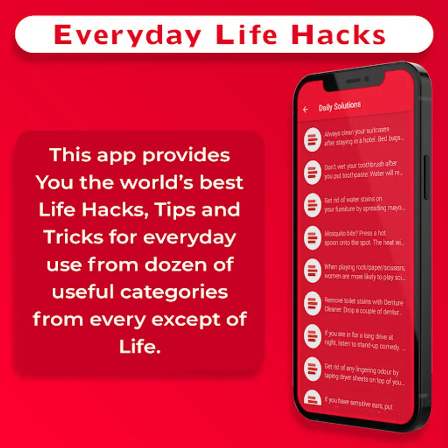 Daily Life Hacks Collection is a free, offline and best app that contains largest collection of most useful celebrating tips, daily clever hacks, dating tips, relationship tips and money saving ideas that you ever wish for.