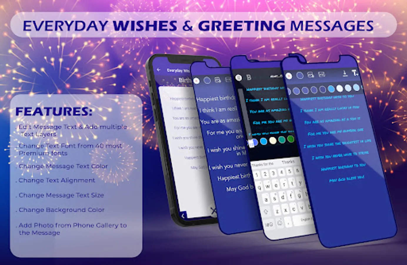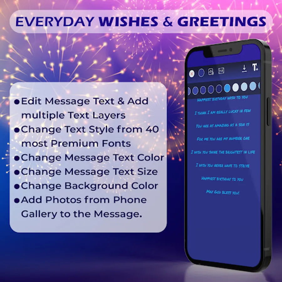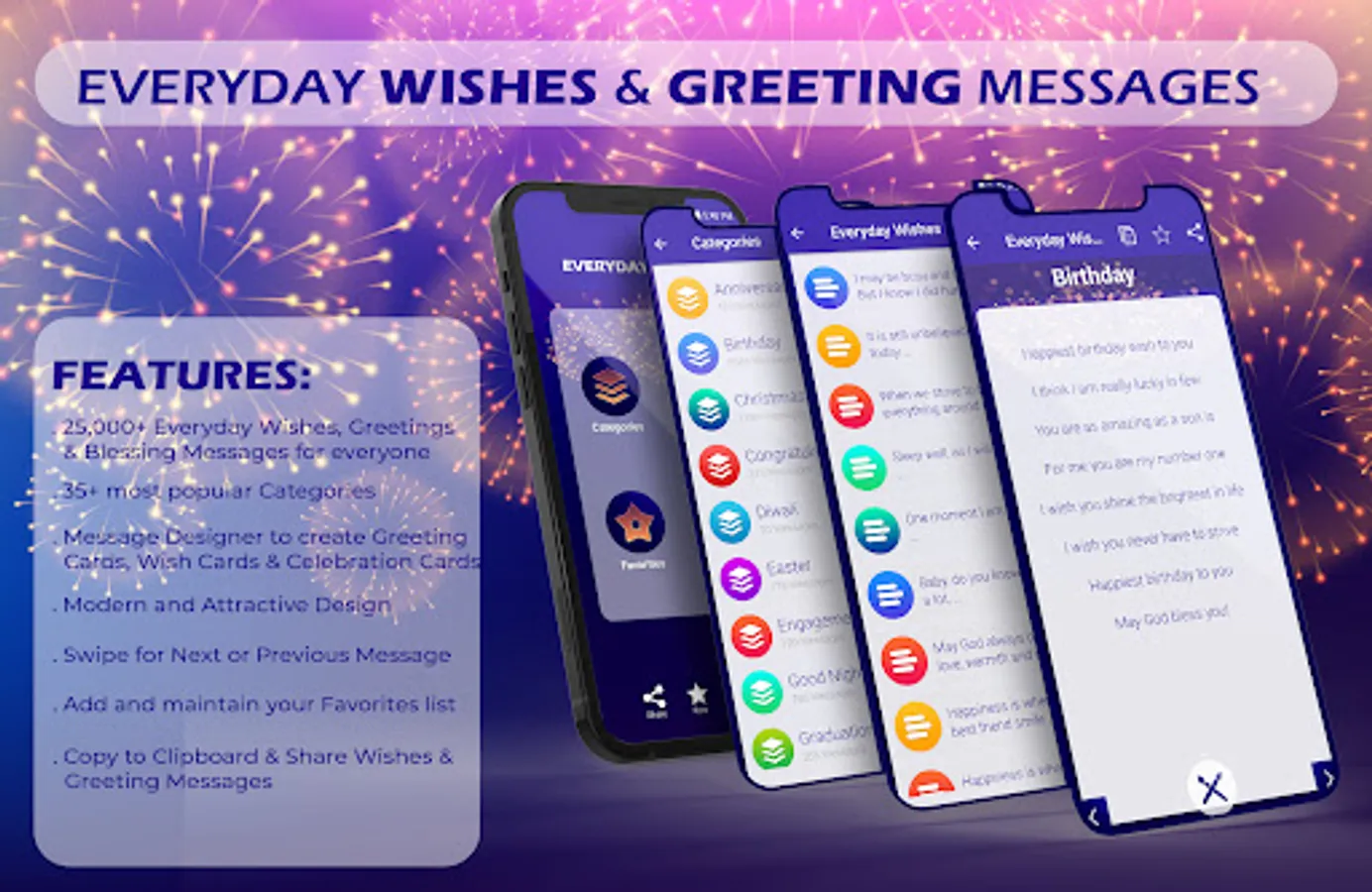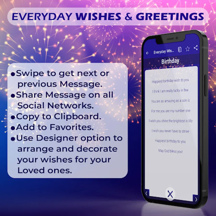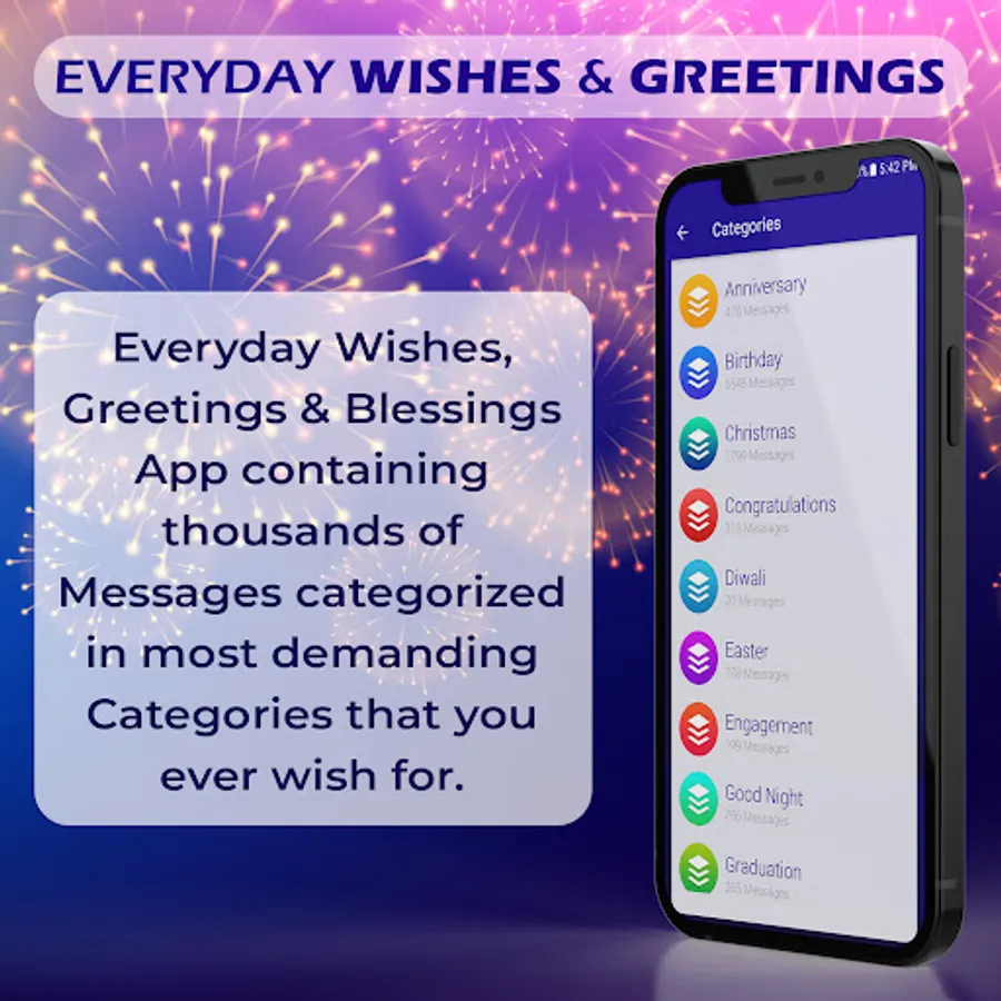 Everyday Wishes and Greeting Messages contains every category that you will need in your everyday routine and for all kind of festivals, events and occasions such as: new year messages, wedding wishes, anniversary wishes and even congratulation wishes messages.