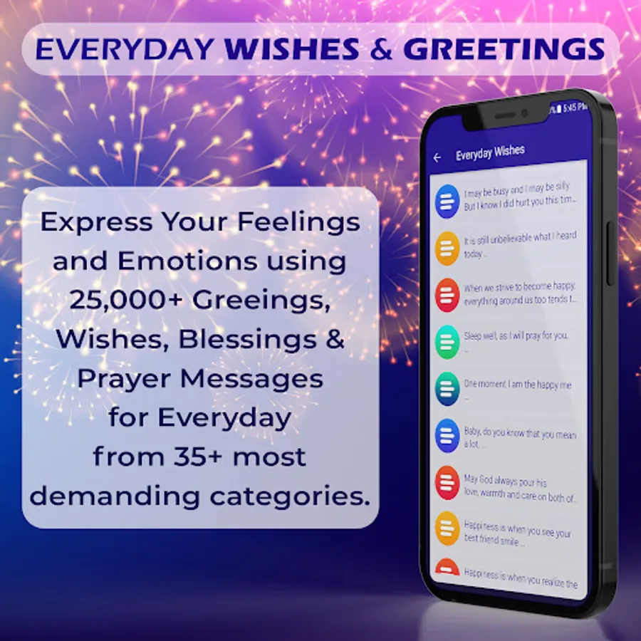 Everyday Wishes & Greetings is an all in one messages app that fulfill your need of everyday greetings and wishes for your dear ones. Everyday Wishes Messages is the best app to share your feelings and emotions with your friends and family through beautiful and heart touching wishes, greeting messages, prayer messages.