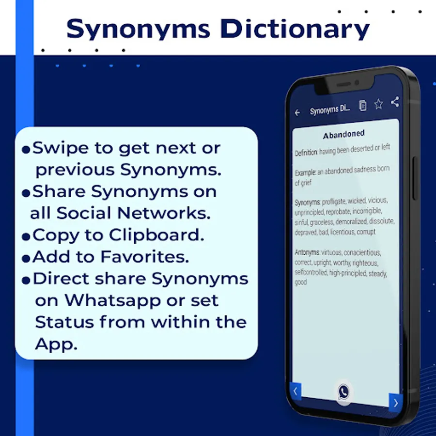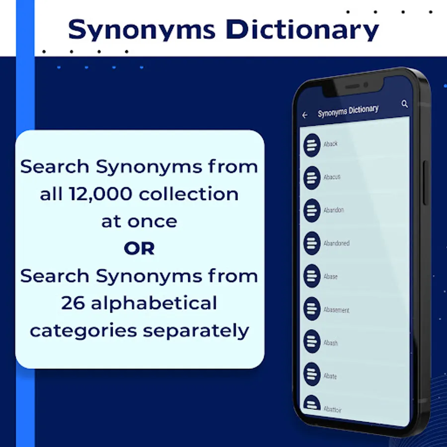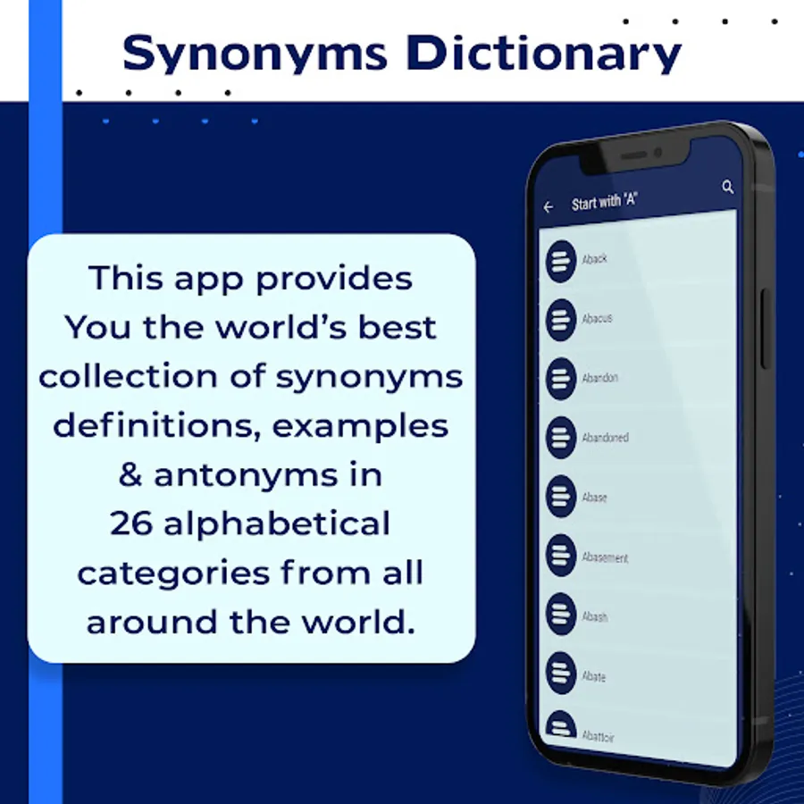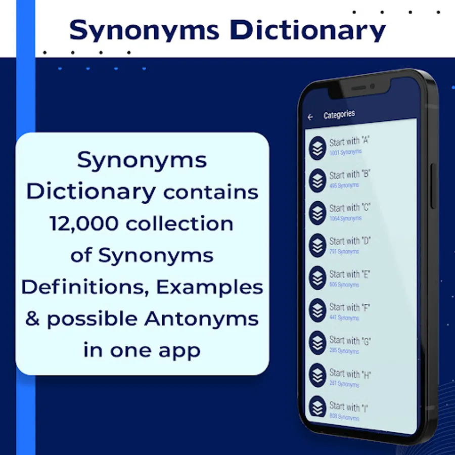 Synonyms Dictionary is an all in one synonyms antonyms dictionary app for you to help you in your everyday routine in learning new synonyms terms every time. Synonyms Dictionary is the best app to share daily synonyms terms, definitions, usage and possible antonyms with your friends and family from 12,000 precised synonyms antonyms arranged in 26 alphabetical categories related to different fields of education.
