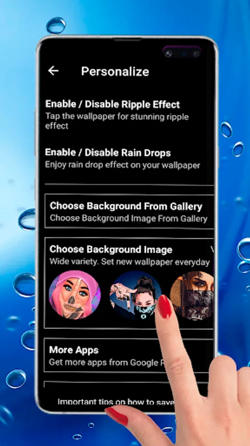INTERACTIVE LIVE WALLPAPERS WITH REAL WATER RIPPLE EFFECT! It is something totally new in modern society, what makes smartphones look special. Many diffreremt themes of cute wallpapers will easily suit to kids, teens, adults and even seniors. Such app allows you to customize cool wallpapers of 4K resolution in the way you like it. Among the benefits you will not have to worry about battery life and free space as this app is very friendly to + smartphones.