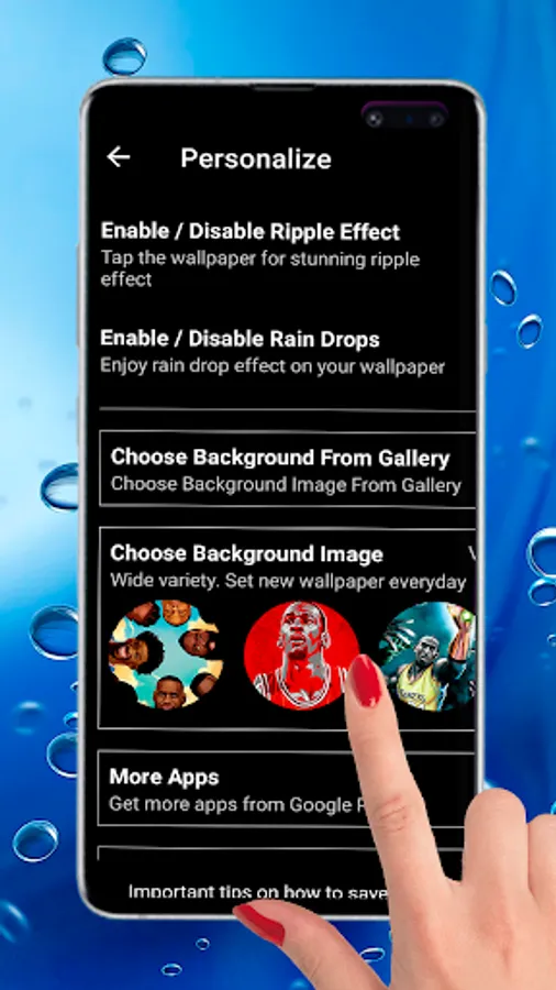 INTERACTIVE LIVE WALLPAPERS WITH REAL WATER RIPPLE EFFECT! It is something totally new in modern society, what makes smartphones look special. Many diffreremt themes of cute wallpapers will easily suit to kids, teens, adults and even seniors. Such app allows you to customize cool wallpapers of 4K resolution in the way you like it. Among the benefits you will not have to worry about battery life and free space as this app is very friendly to + smartphones.