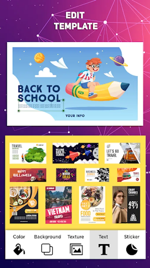 Create thumbnail and banner, promotional posters, leaderboard , flyer, advertisement, offer announcements, cover photos on the go with amazing backgrounds, texture, effects, fonts, sticker and get the attention you want.