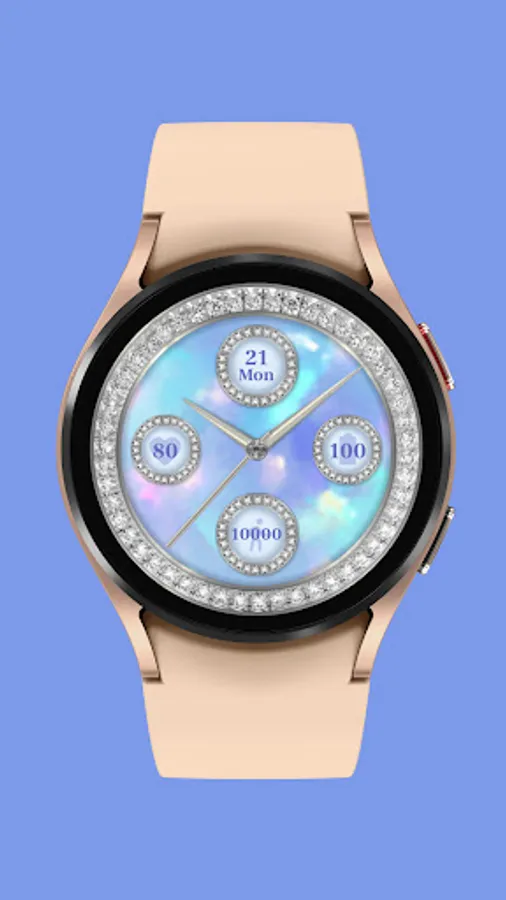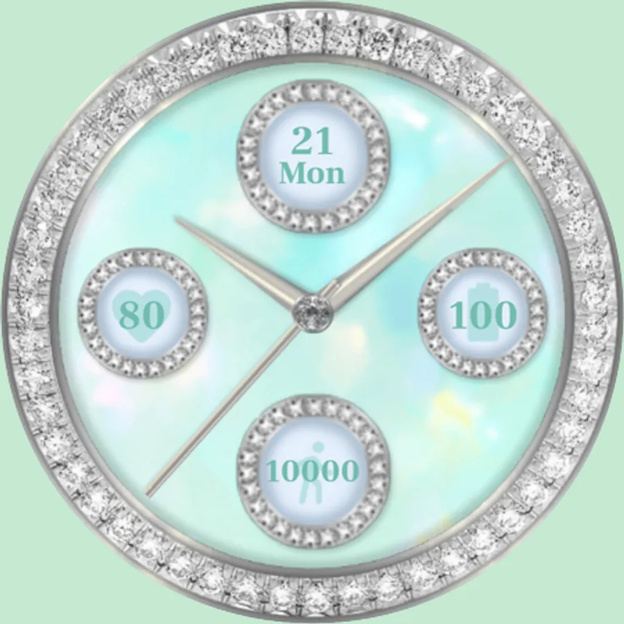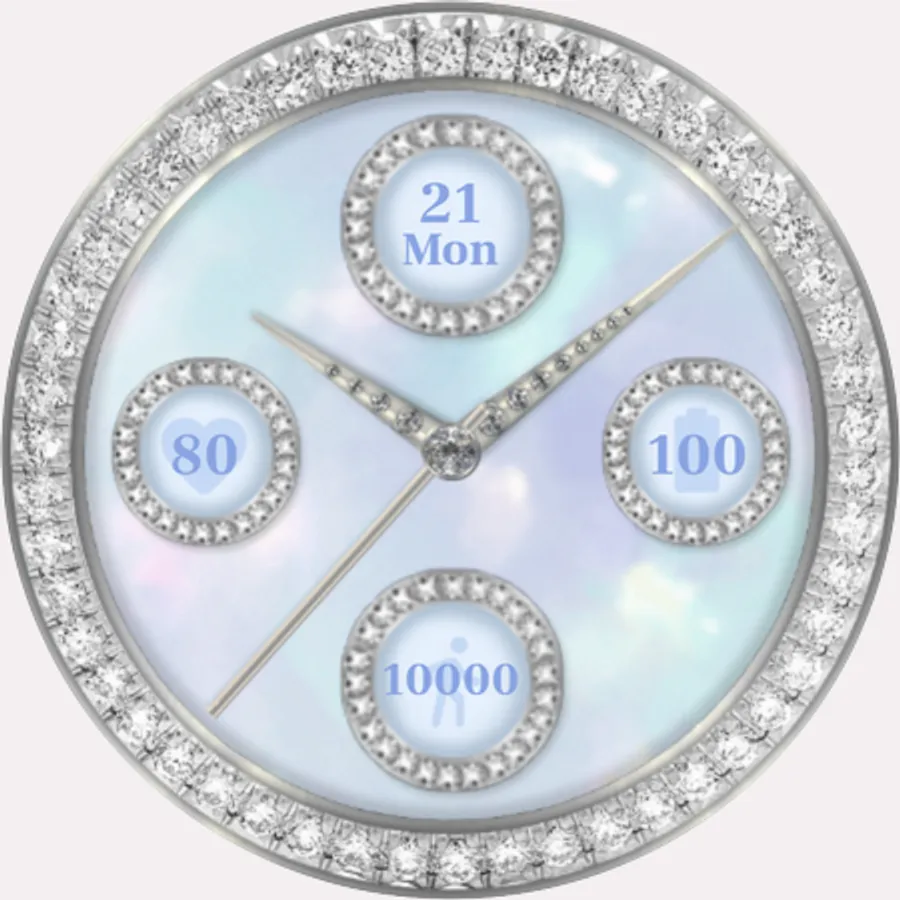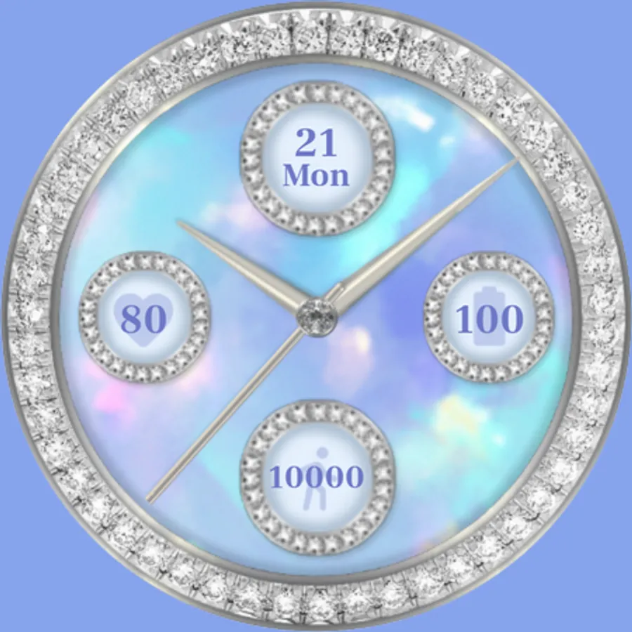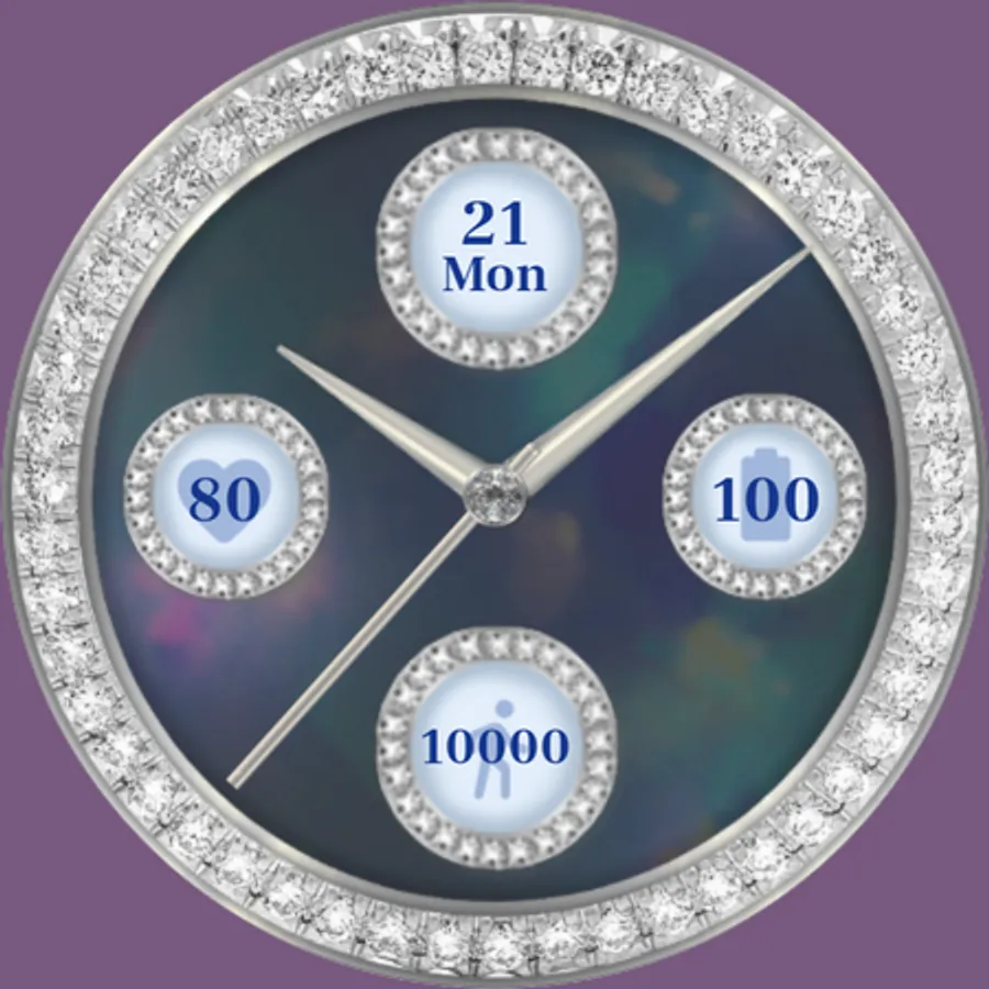 Diamond Opal: Analog Edition is an elegant analog watch face designed for WearOS devices with round screens. The display features a diamond bezel with a delicate opal dial. View the time and date, heart rate*, steps, and battery level of your device surrounded by more diamonds. The border of the step counter gradually fills with diamonds as you approach 10,000 daily steps. Customize your watch with 6 background and color options as well as two different hand styles.
