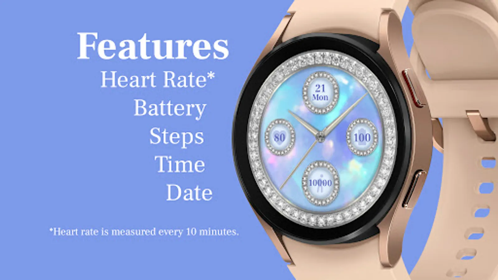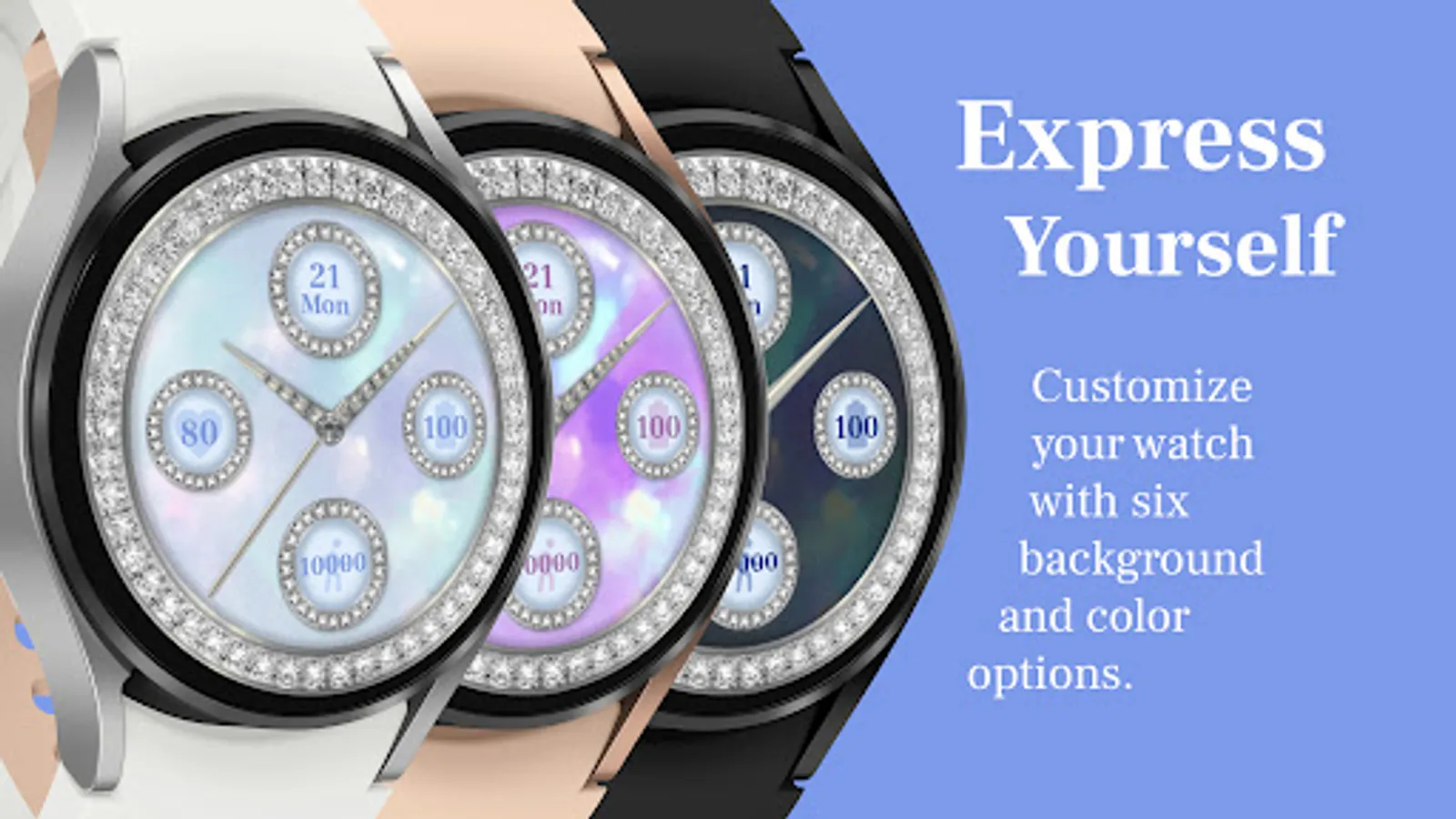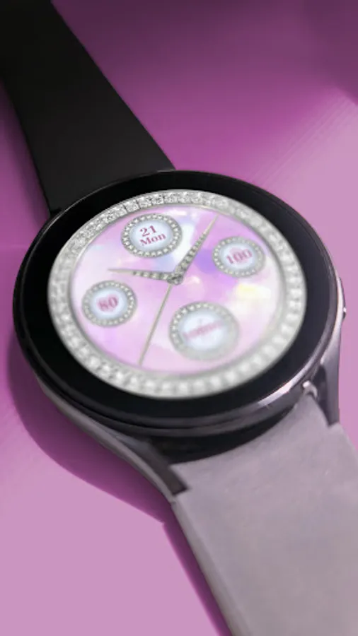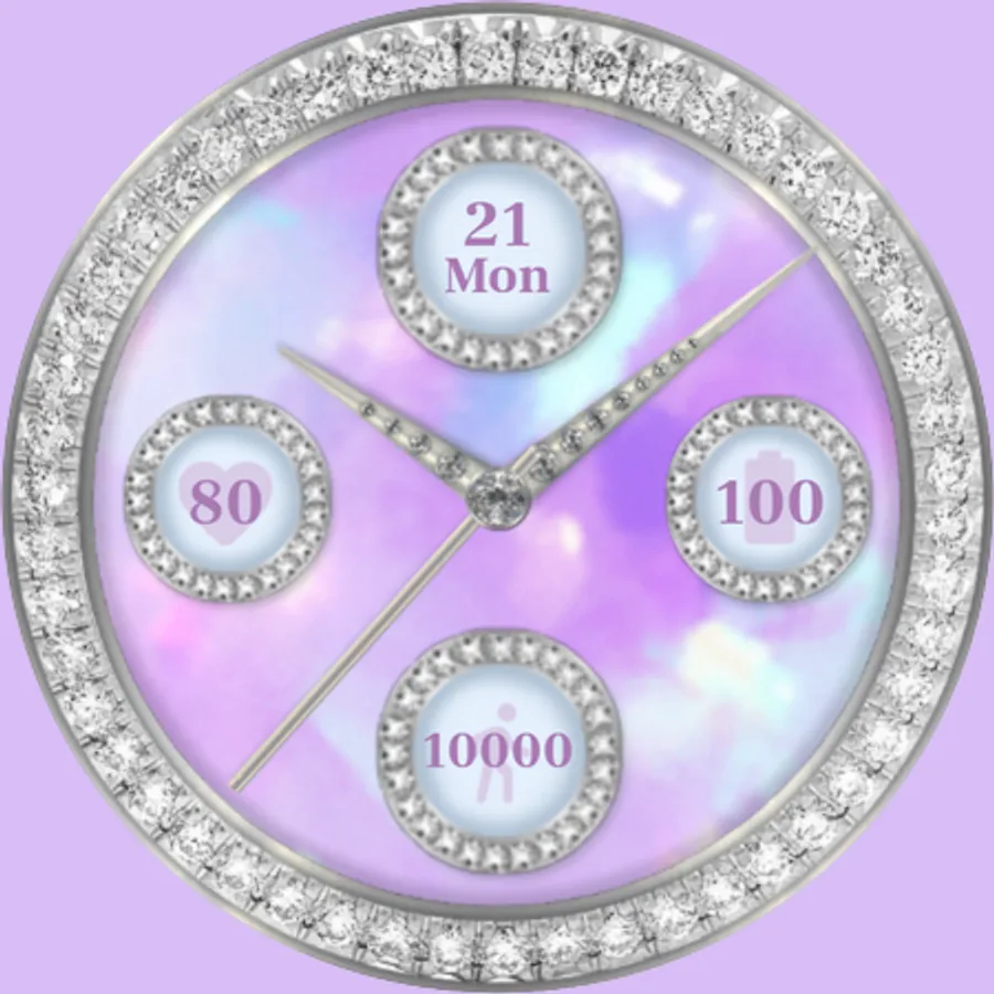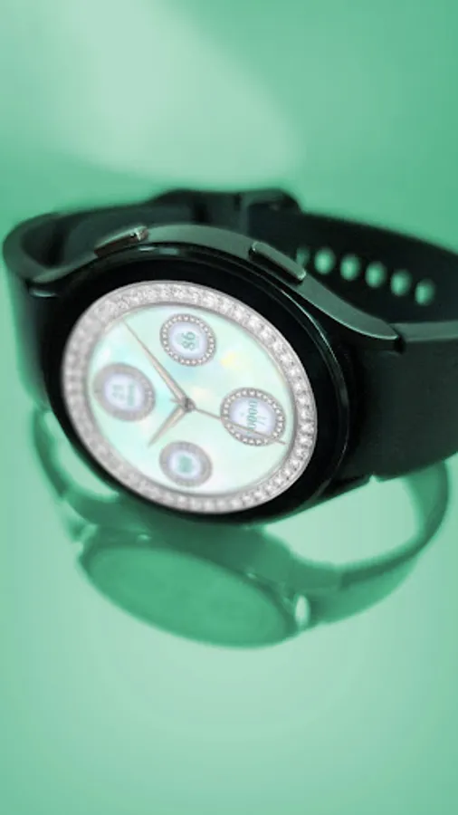 Diamond Opal: Analog Edition is an elegant analog watch face designed for WearOS devices with round screens. The display features a diamond bezel with a delicate opal dial. View the time and date, heart rate*, steps, and battery level of your device surrounded by more diamonds. The border of the step counter gradually fills with diamonds as you approach 10,000 daily steps. Customize your watch with 6 background and color options as well as two different hand styles.
