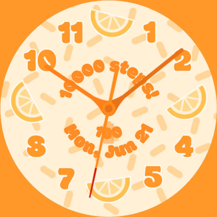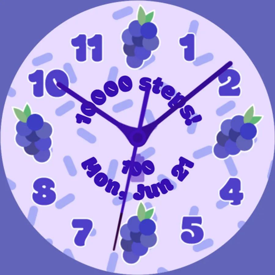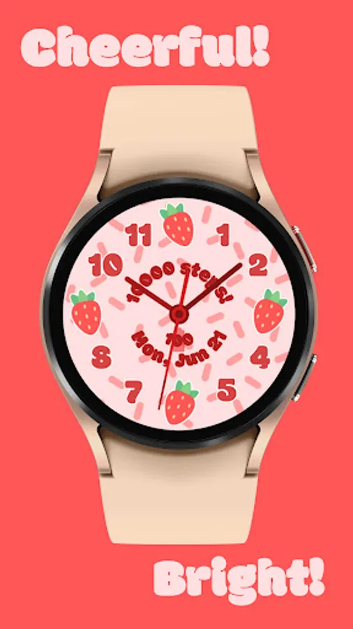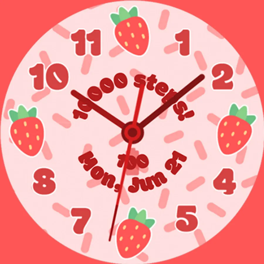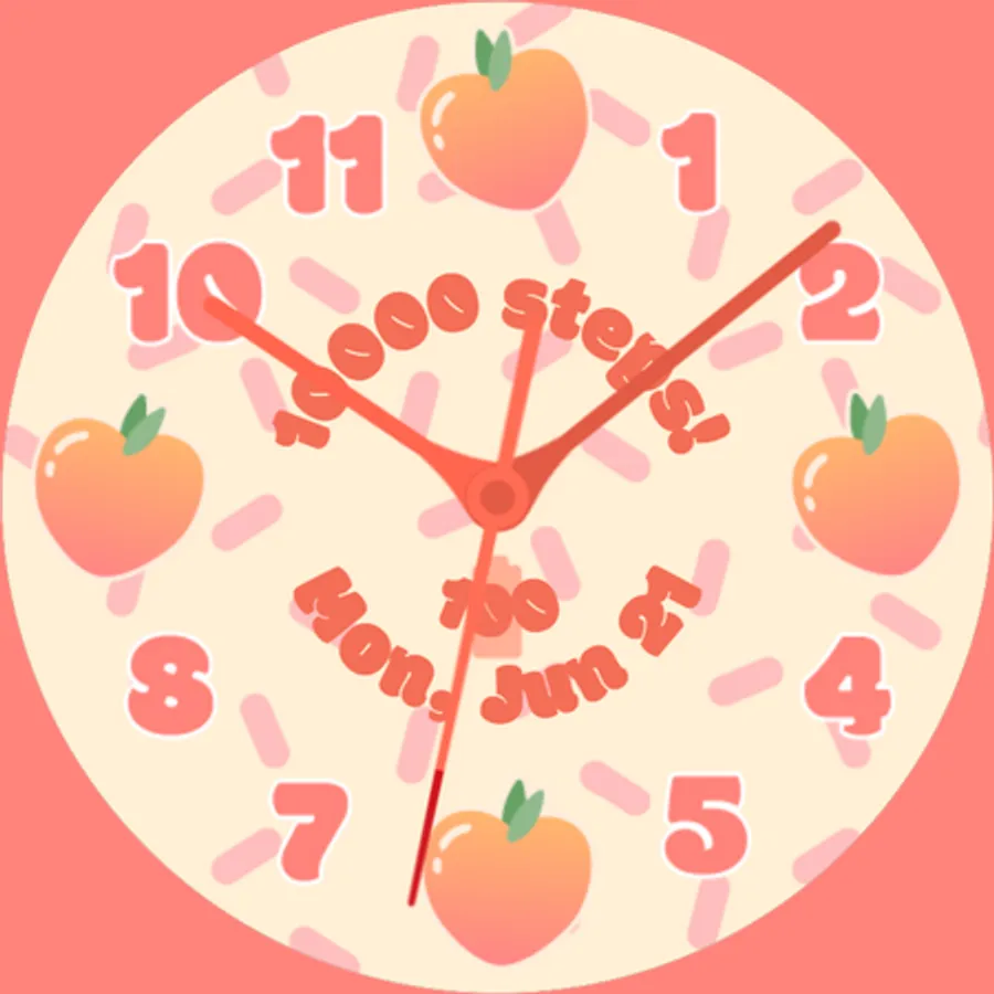 Fruit Cup: Analog Edition is a fun, vibrant watch face for WearOS watches with round screens. Bring an element of joy to every minute when you use this cute and colorful face. The display shows the time, date, current step count, and current battery level. Featuring six different background options, six different fruit options, six different color options, and two different hand options, Fruit Cup: Analog Edition allows you to customize your watch to your heart's content!