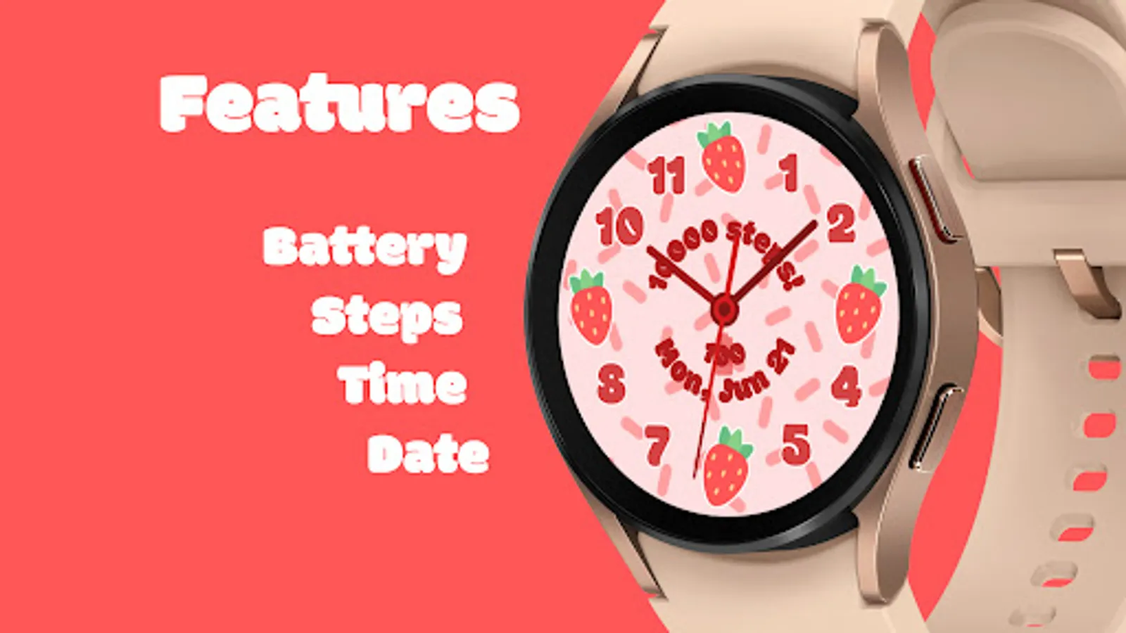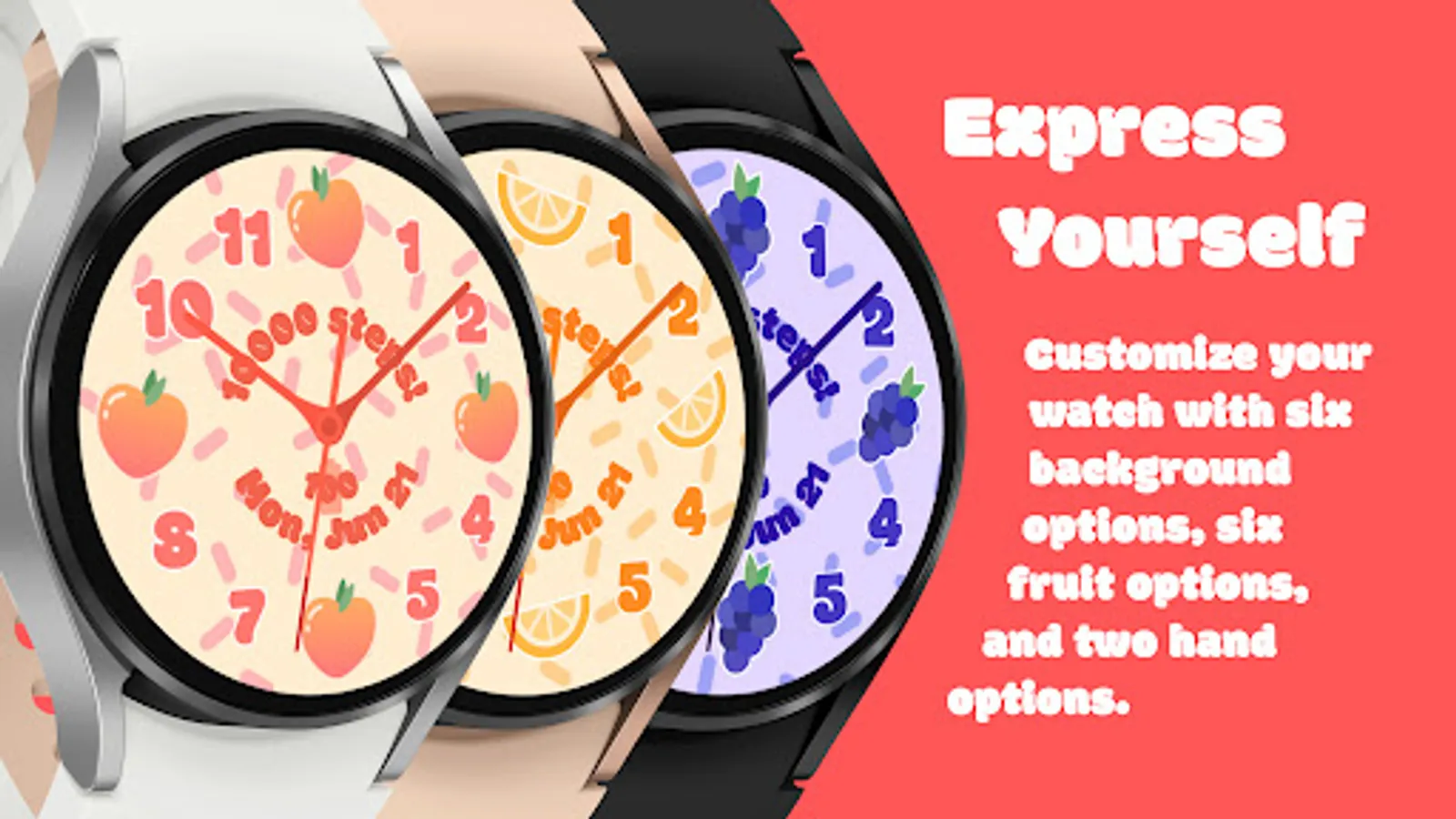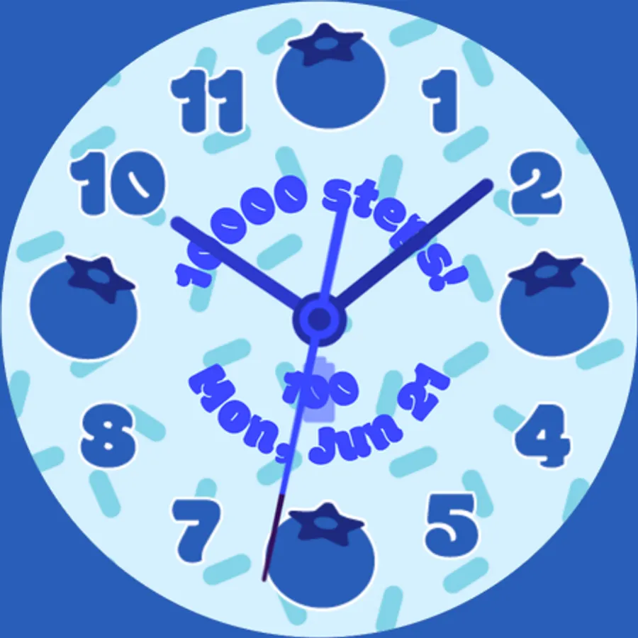 Fruit Cup: Analog Edition is a fun, vibrant watch face for WearOS watches with round screens. Bring an element of joy to every minute when you use this cute and colorful face. The display shows the time, date, current step count, and current battery level. Featuring six different background options, six different fruit options, six different color options, and two different hand options, Fruit Cup: Analog Edition allows you to customize your watch to your heart's content!