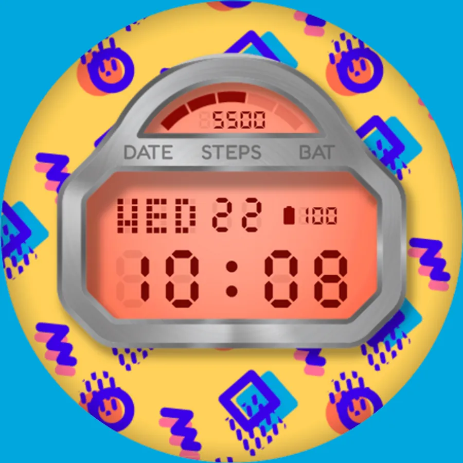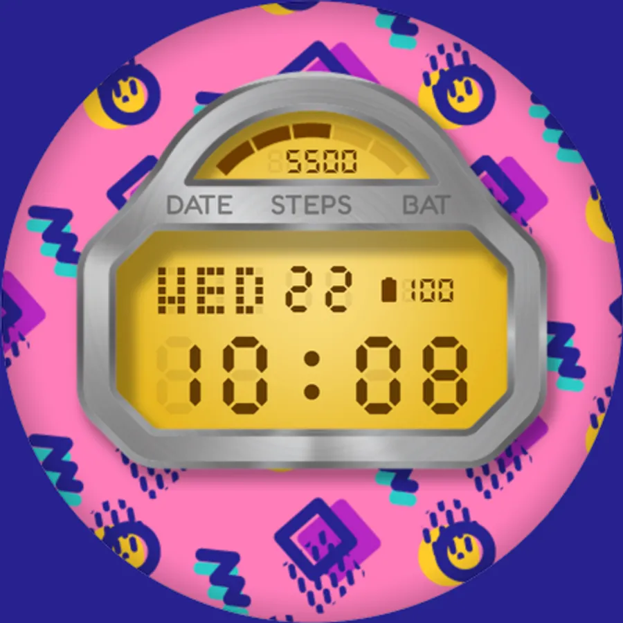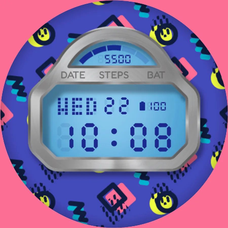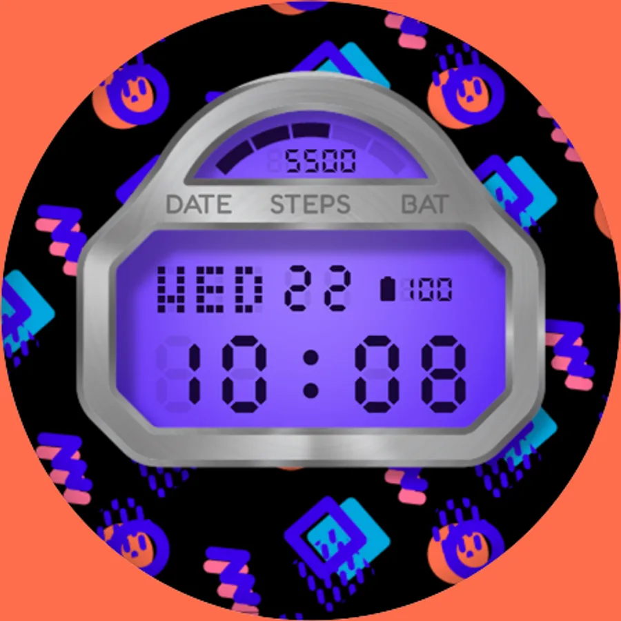 Retrograde Digital is a fun, colorful watch face with a retro vibe! Featuring an LCD display, Retrograde Digital shows the time, date, step count, and battery. A gauge above your step count shows your progress to the recommended 10,000 daily steps. Customize your watch with four different backgrounds, colors, and LCD displays! Each color, background, and display is designed to coordinate to create up to 64 combinations.