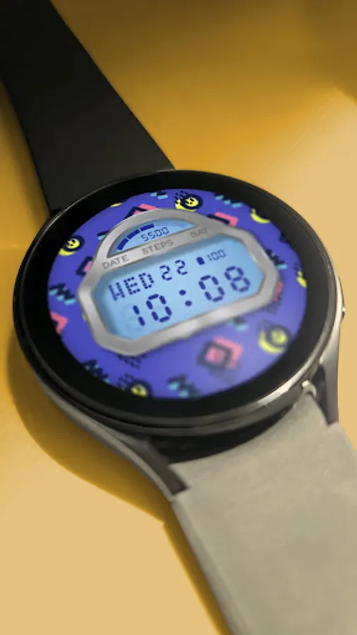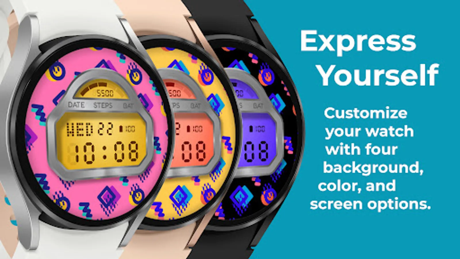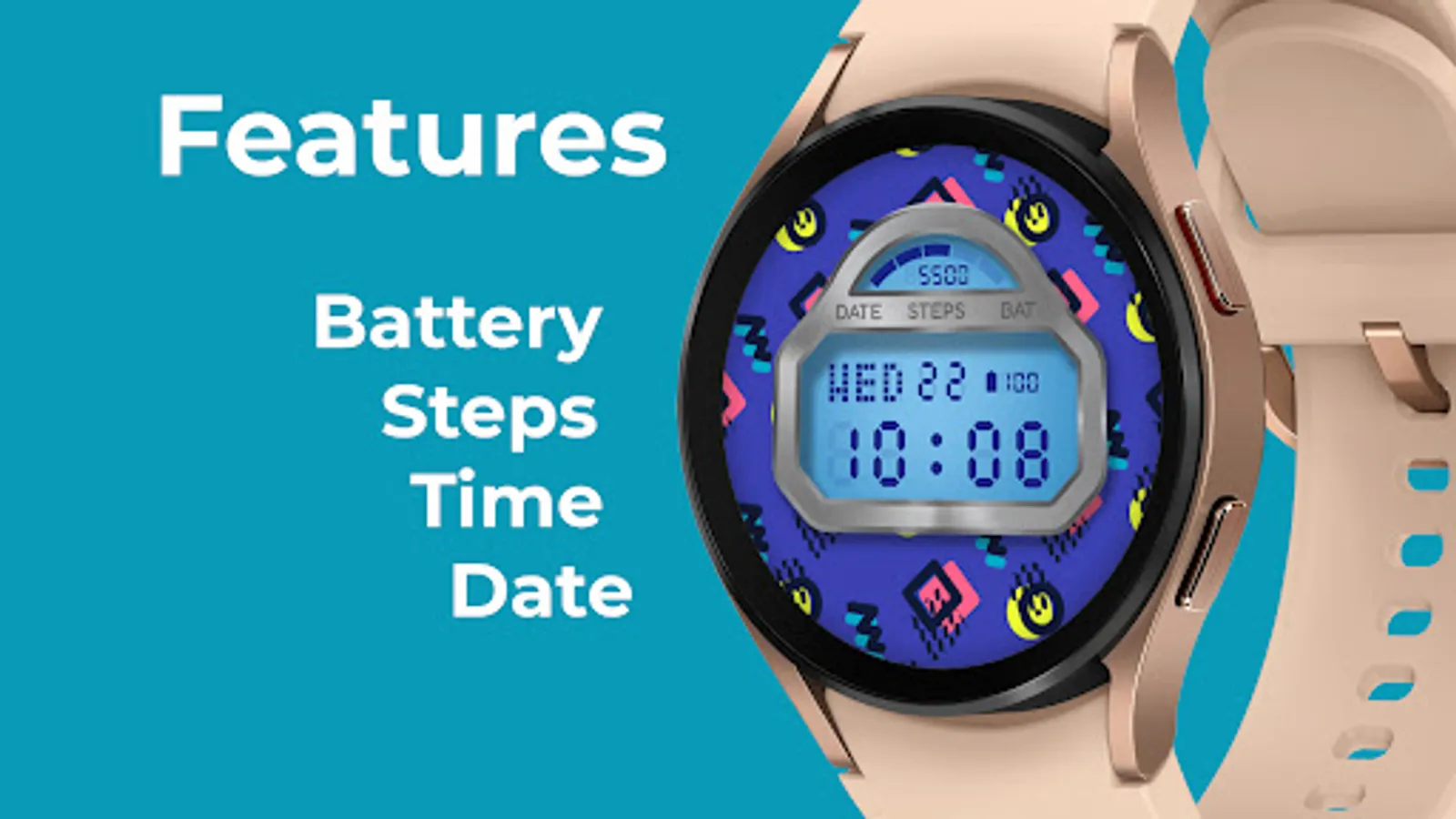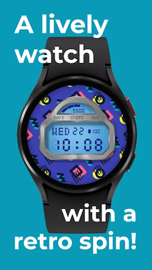 Retrograde Digital is a fun, colorful watch face with a retro vibe! Featuring an LCD display, Retrograde Digital shows the time, date, step count, and battery. A gauge above your step count shows your progress to the recommended 10,000 daily steps. Customize your watch with four different backgrounds, colors, and LCD displays! Each color, background, and display is designed to coordinate to create up to 64 combinations.