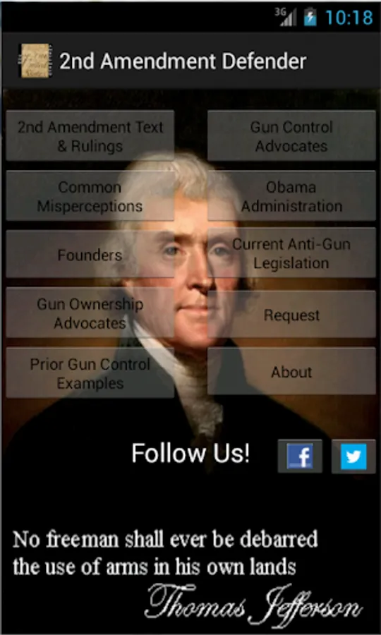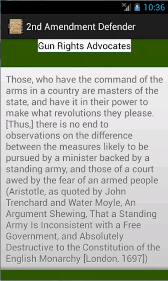 These citations have been collected from many 2nd Amendment related sources, and are now found here, in a single, easy to access smartphone app. This app can help anyone educate others about why the 2nd Amendment is important, and subsequently defend it. This is intended to be the absolute best app to help you defend the 2nd Amendment app available.