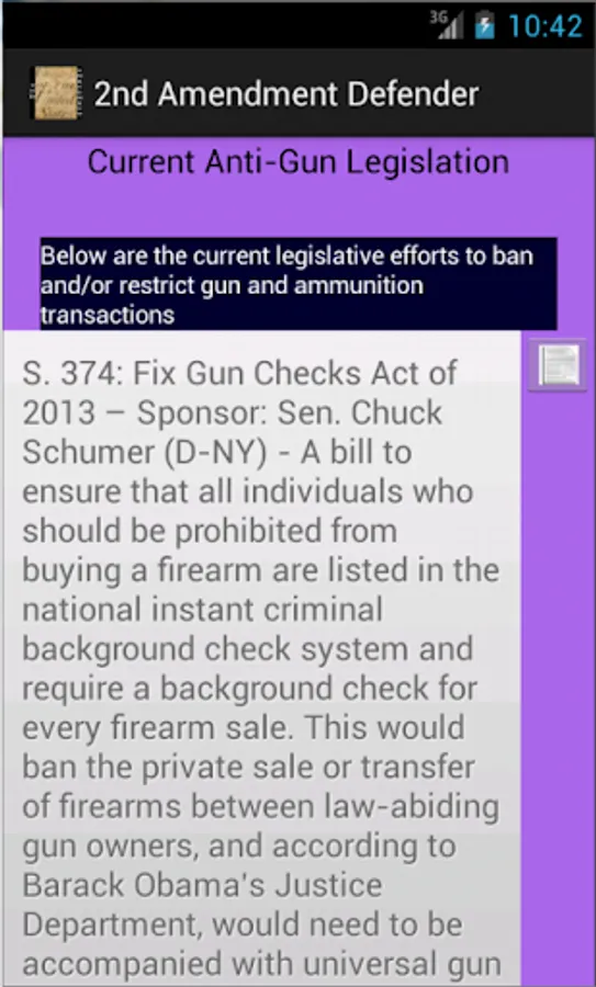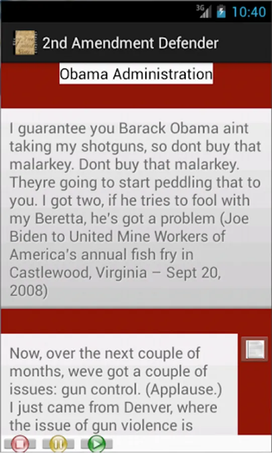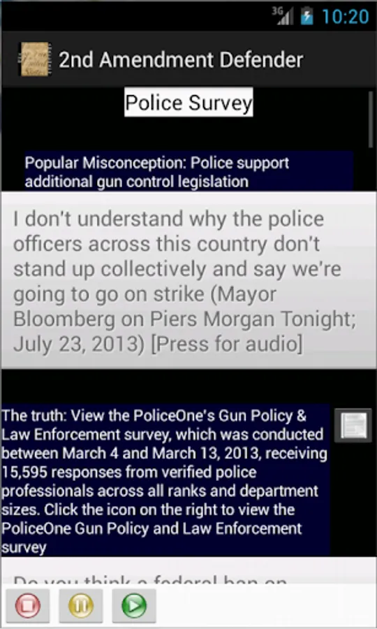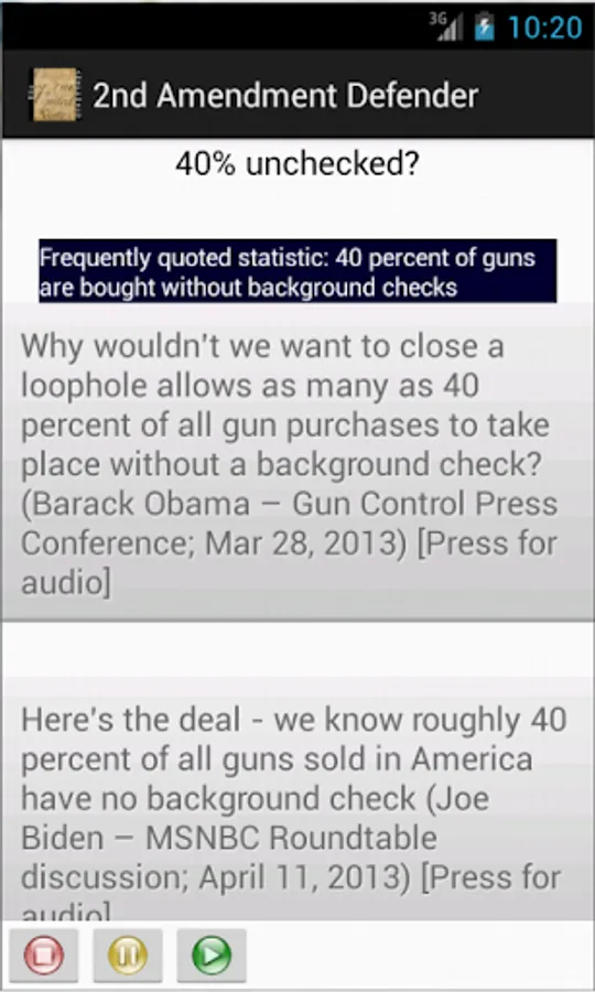 Do you perceive that there is an effort to increase gun control and weaken the 2nd Amendment? Do you find it concerning that a survey from March 2013 found that 56% of Americans believe the number of crimes involving a gun is higher than it was 20 years ago, even though the crime rate is significantly lower? Does the frequent citing by multiple sources of the flawed statistic that up to 40% of firearm purchases occur without a background check annoy you? Have you tried to express your concerns to friends, and family, only to be called a bitter-clinger? This app brings together a collection of data, audio quotes, including links to the source content, and puts it all at your fingertips.