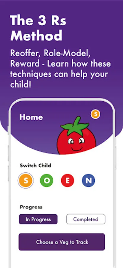 The app includes tips and information for encouraging children to eat vegetables (including the 3 Rs method – Reoffering, Role-modelling, Rewarding), as well as tools to help you put them into action.