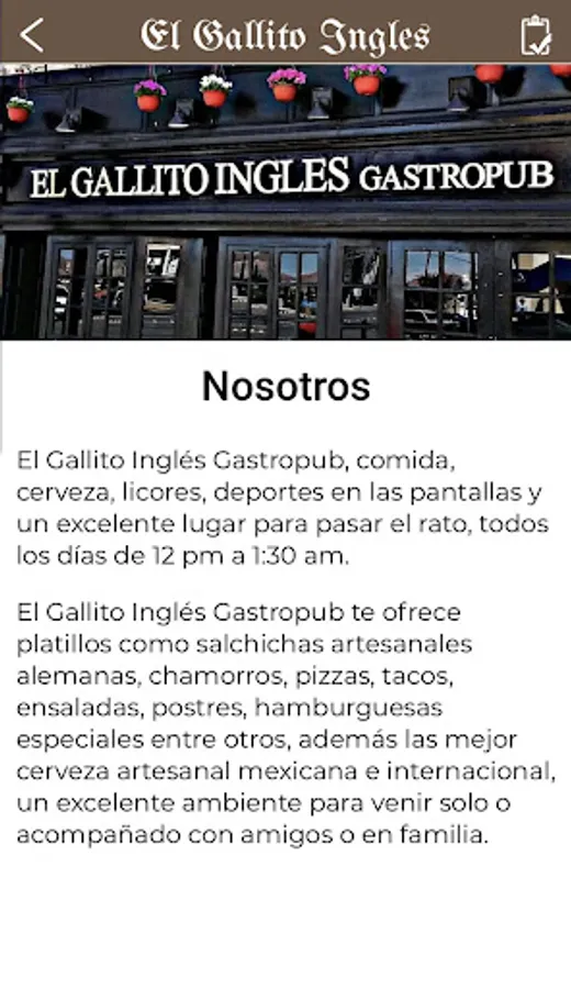 The Gallito Inglés Gastropub offers you dishes such as German artisan sausages, chamorros, pizzas, tacos, salads, desserts, special burgers among others, in addition to the best Mexican and international craft beer, an excellent atmosphere to come alone or accompanied with friends or family.