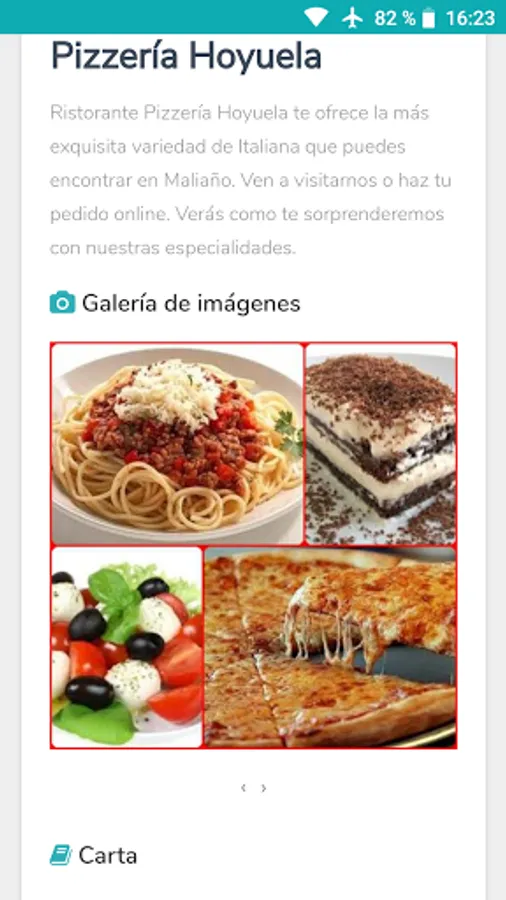 Download the Pizzeria Hoyuela app and you can place orders at home or pick them up. You will find a variety of pizzas, salads, pastas.