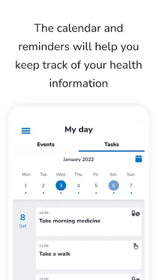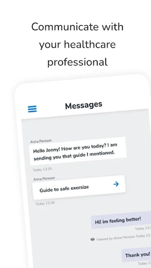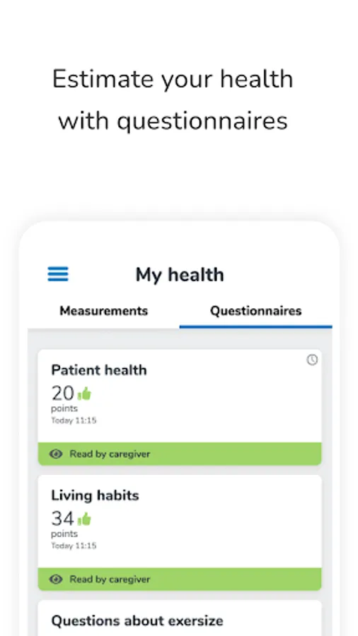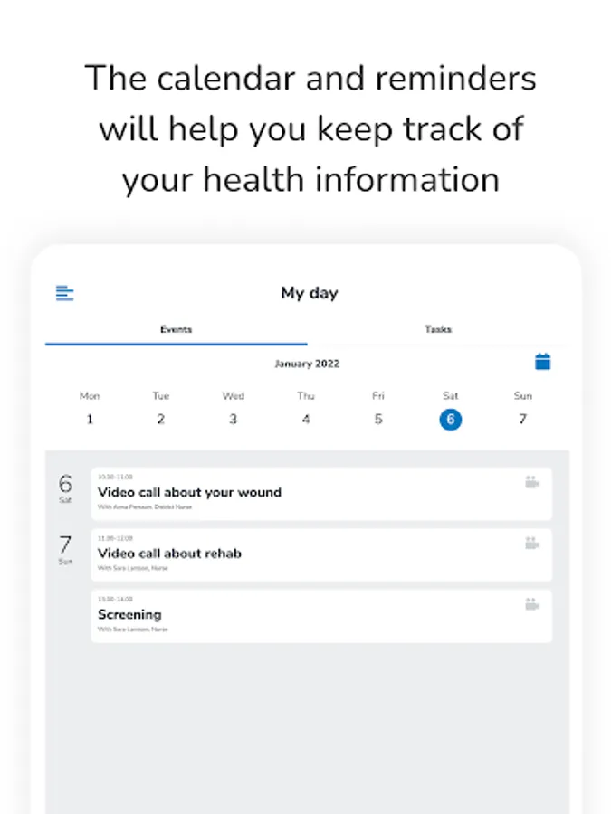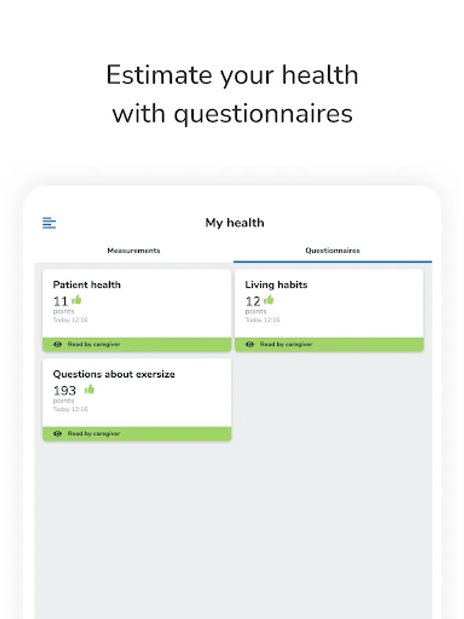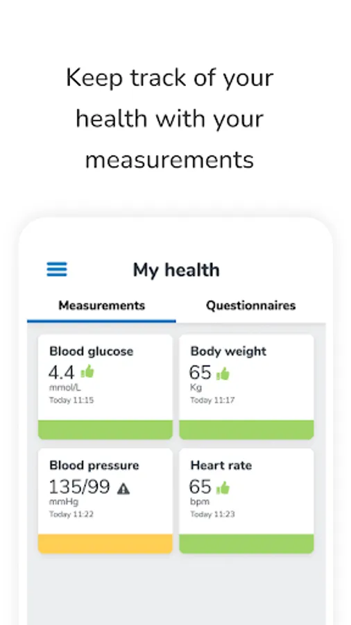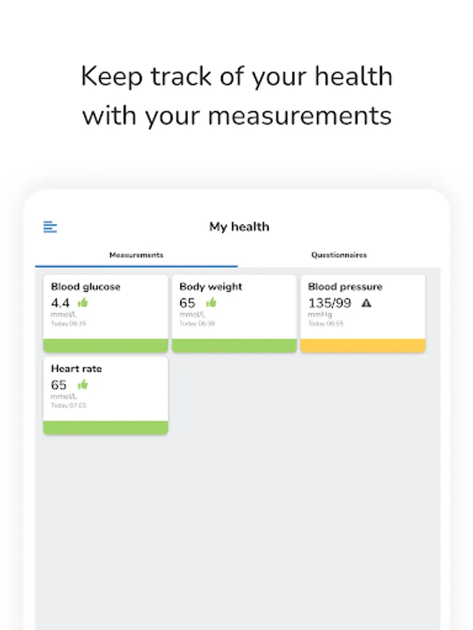 The care team creates a care plan for you when you join the service. Via the app, you get a number of tasks to perform, for example taking a measurement or answering a questionnaire. Your health data is collected in the app when you register your values. You and the care team also have the opportunity to communicate with each other in the app.
