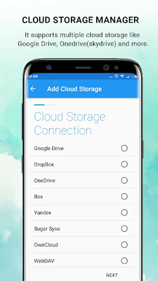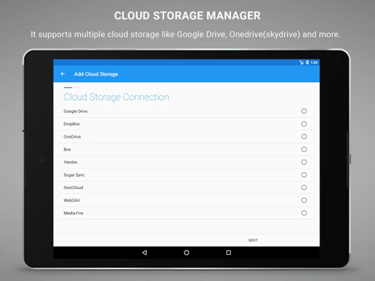 * The app supports multiple cloud storage as Google Drive, Dropbox, Box, OwnCloud, Yandex, Sugarsync, WebDAV, Mediafire, and some more.