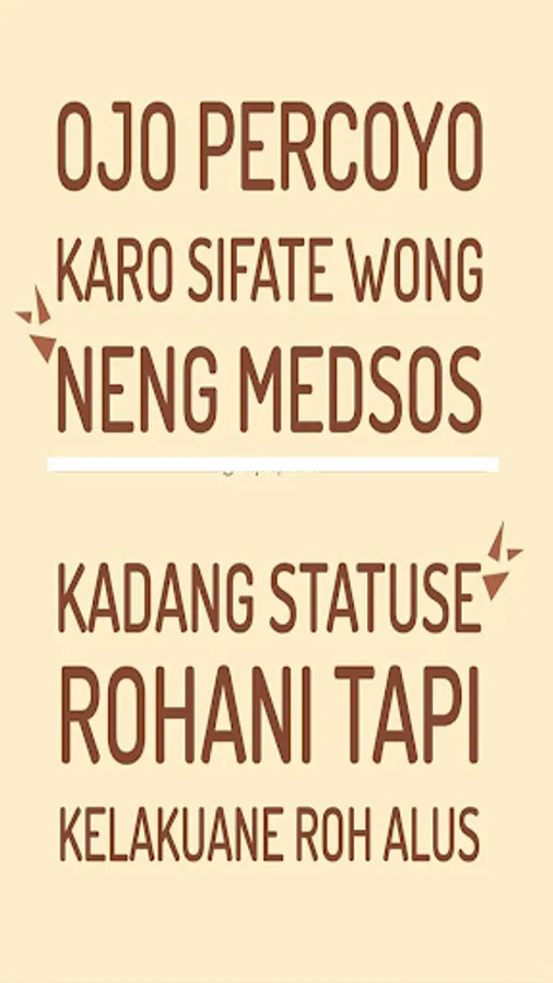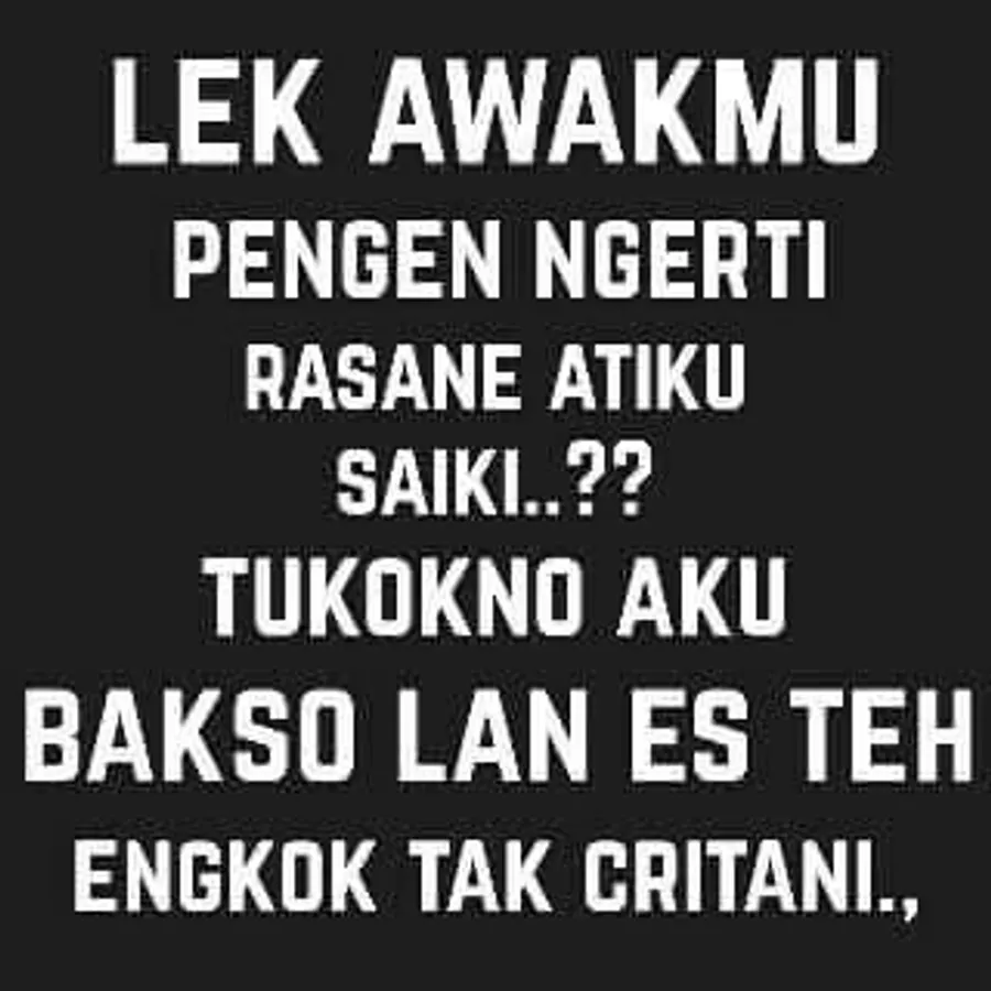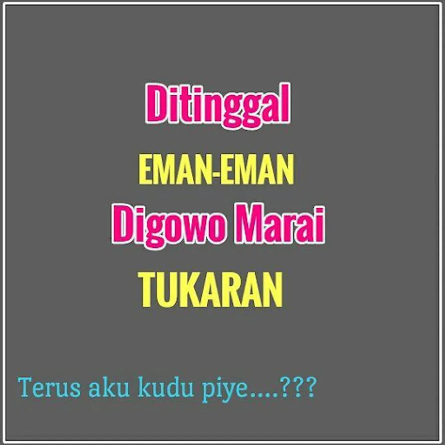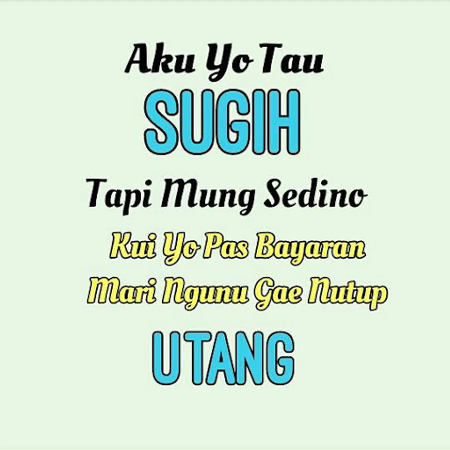 Collection of Funny Javanese Status for you android users. Cool Words for status updates on Facebook, chat applications, and other social media with funny and motivating Javanese language, not only contains entertainment but also a collection of Javanese advice and Javanese noble philosophy that is fiber about the meaning of Javanese life.