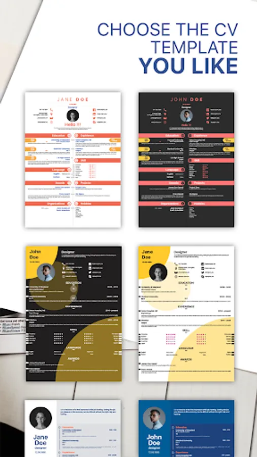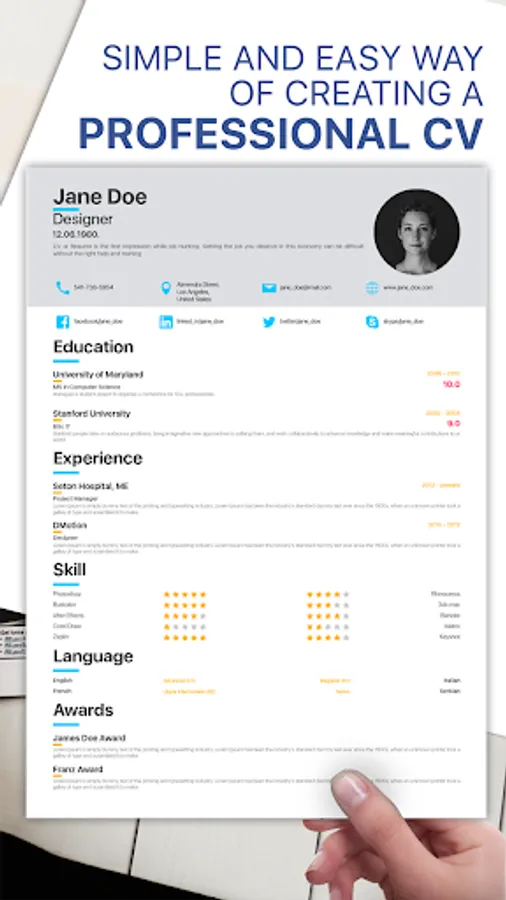 Decide what kind of design your quick resume will have. The Resume Builder - CV Maker offers you numerous resume templates that i can download for free. Although you have all the necessary qualifications, your cv with photo can look messy if you don't use a proper resume builder app free. That is why you should start with a professional cv format and build your resume designer from scratch. Create as many curriculum vitae versions as you want and save them to the resume library. If you want, you can even use the data from the last cv to complete your new cv. As you can see, all you need is a couple of minutes and this cv builder - curriculum vitae app cv maker. Can I make a cv on my phone? Now you can.