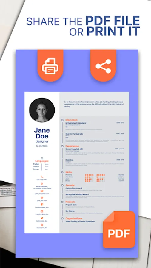 Create a resume for job for free! This Resume Builder - CV Maker, combined with your knowledge and verbal skills during the interview, will place you ahead in the job search. Be careful not to make mistakes that would cost you the job. Your resume shouldn’t simply state the obvious to a hiring manager. Employers need to understand what you've done and accomplished. That is why you need a cv resume generator that will balance the amount of text and white space in the resume. Develop a curriculum vitae that will sweep them off their feet.