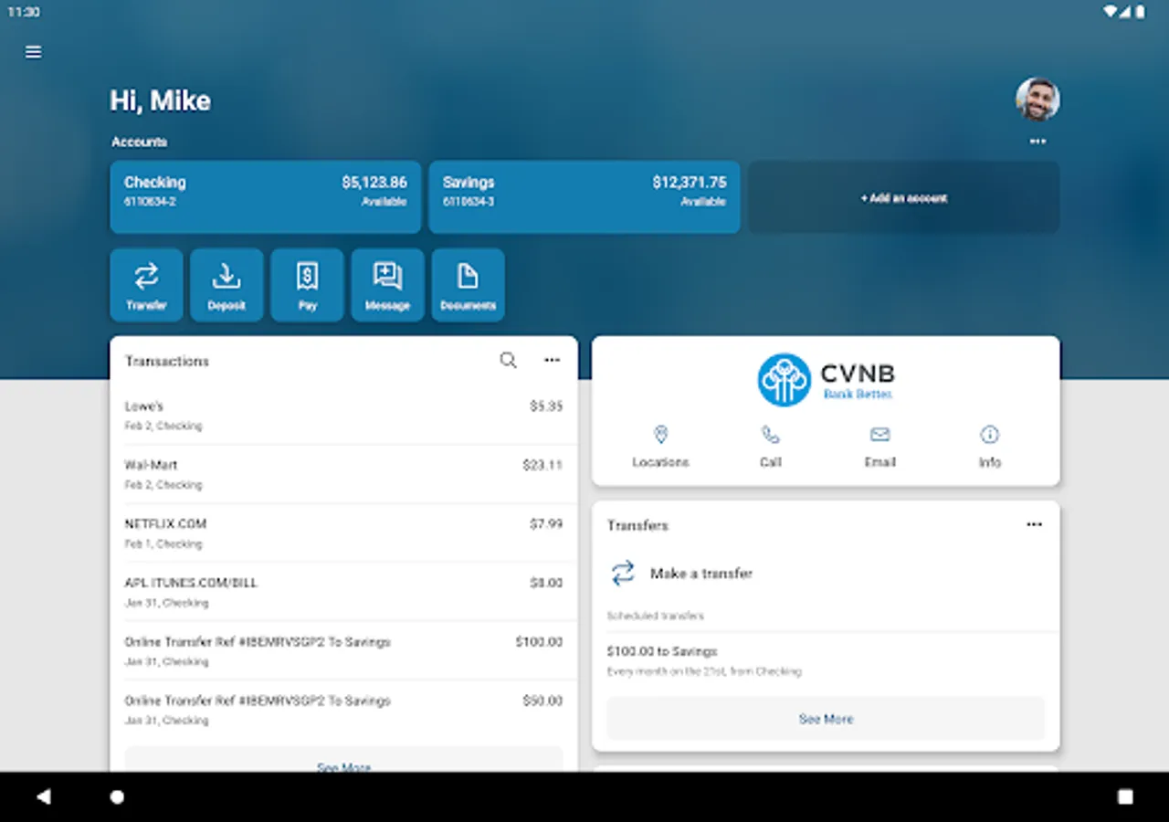 Cumberland Valley National Bank (CVNB) Mobile Baking app allows you to deposit checks, pay bills, view account activity, manage cards, find locations, and more. Available for free to all CVNB customers.