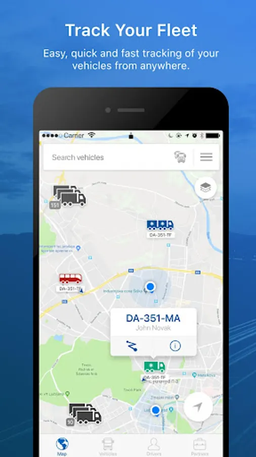 You can view all your vehicles where are located, what is their speed and what it is doing (their status). You can view one or all vehicles on the same map.