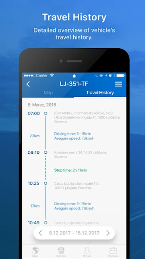 Trip reports are available for 1 month back where you can see all vehicle stops and driven kilometers.