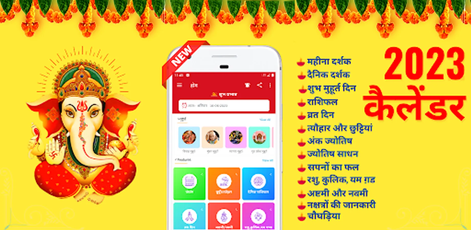 This Hindu calendar 2023 app shows Ragu Kaal, Kulik, Yamganda, Tithi, Yoga, Nakshatra, Dream Fruit, Disha School, Navami and Ashtami, special events.