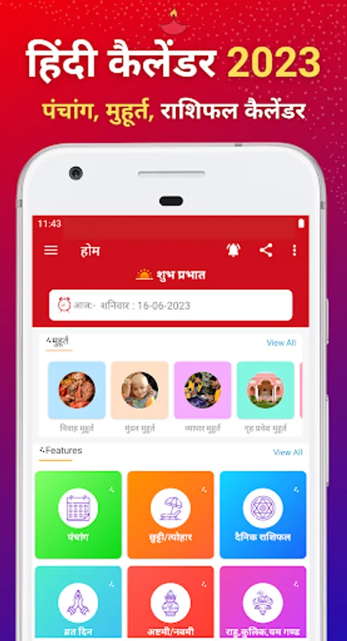 Hindi Calendar 2023 Panchang is also called Indian Calendar. This Hindi Panchang Calendar has all the details. The list of festivals and holidays of 2023 in the Hindi calendar app also provides details of auspicious days, fasting, horoscope, dream fruit, best astrology remedies, Ashtami and Navami, Rahu, Vivah Muhurta days!