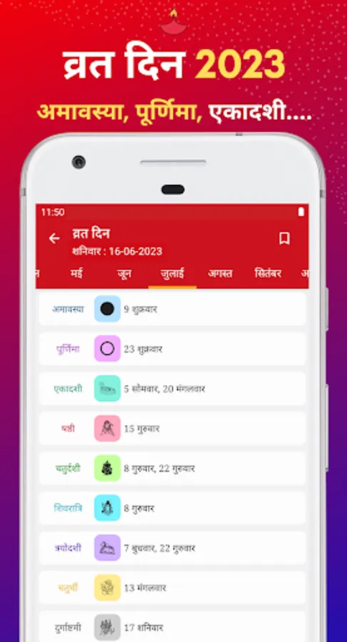 ✔ It gives a month-wise list of all festivals, vrats and muhurtas along with daily panchang.
