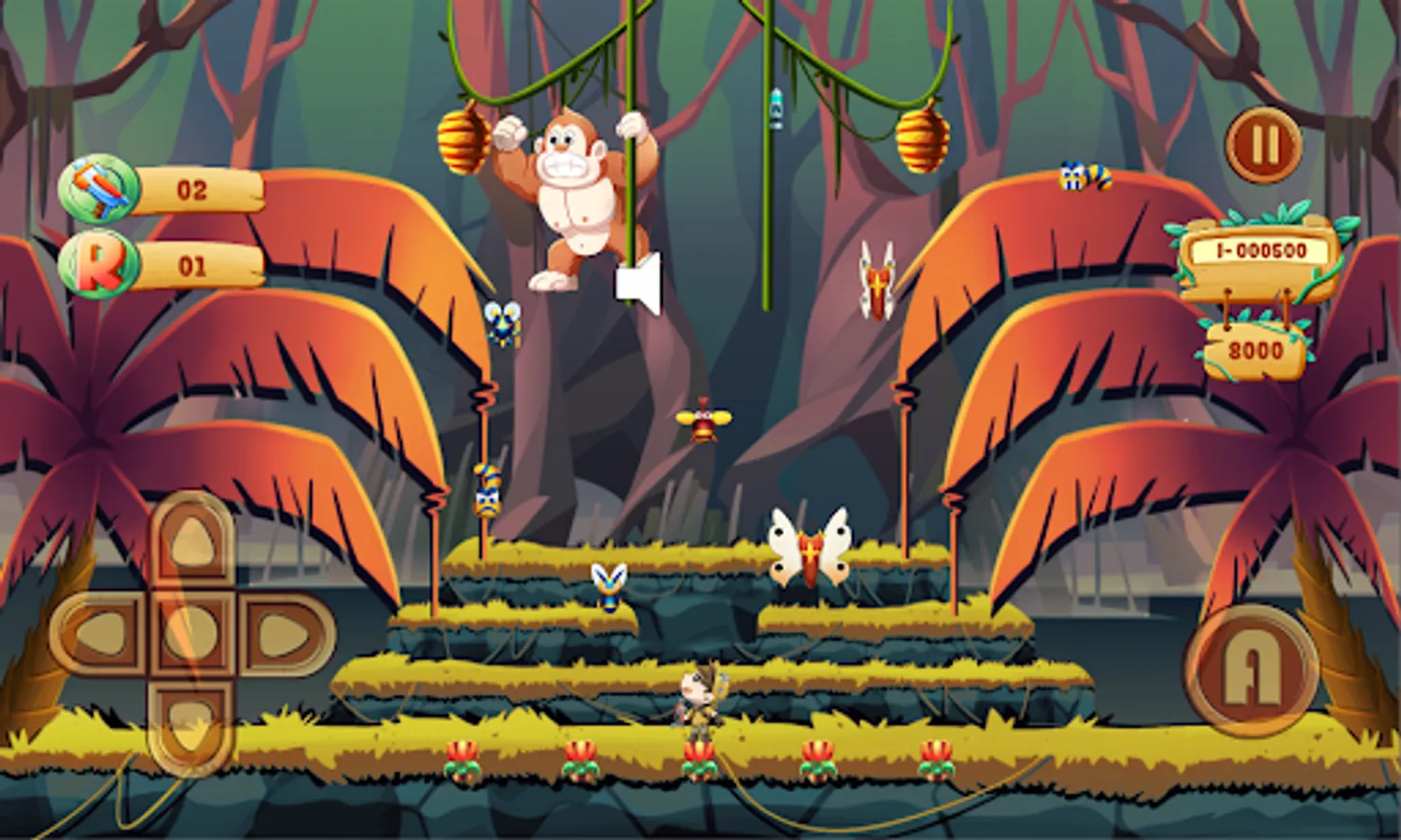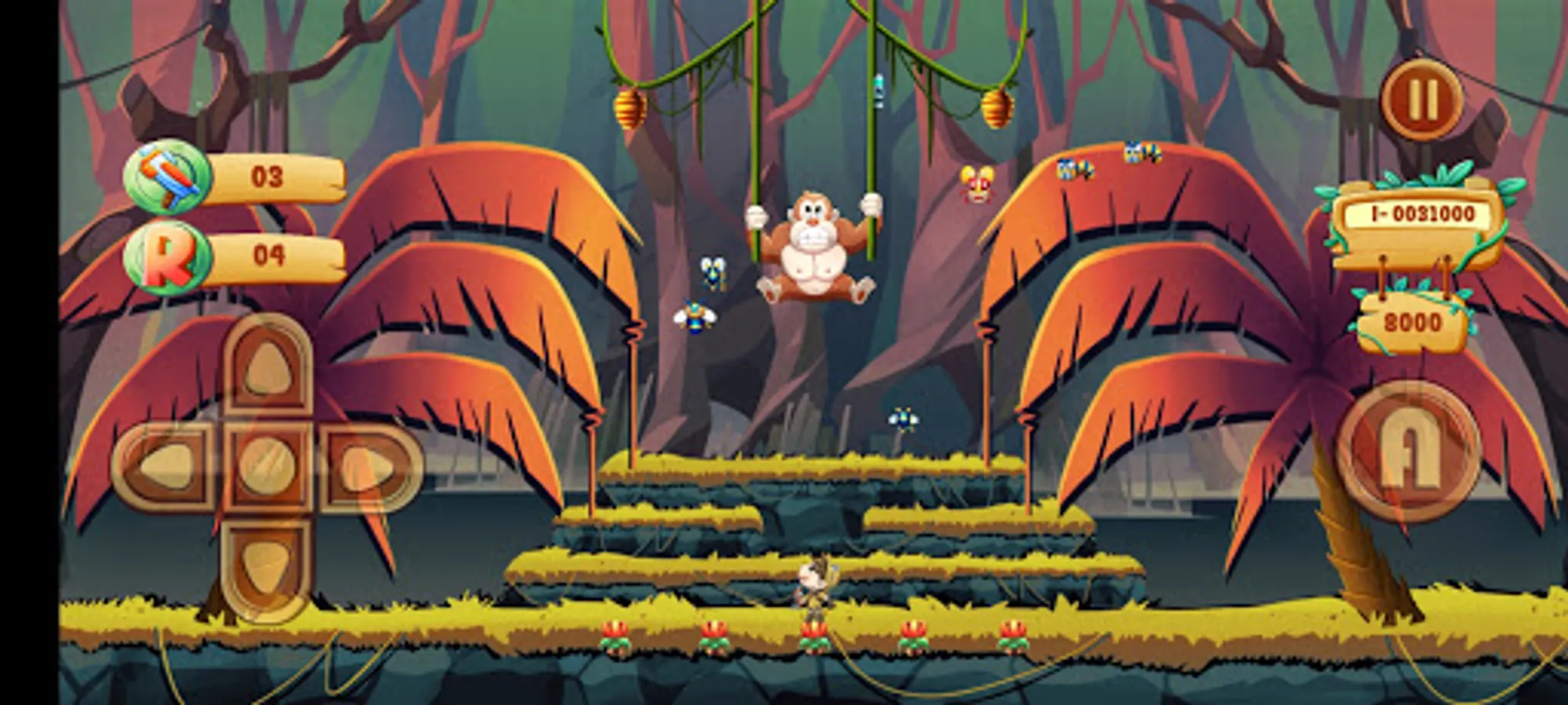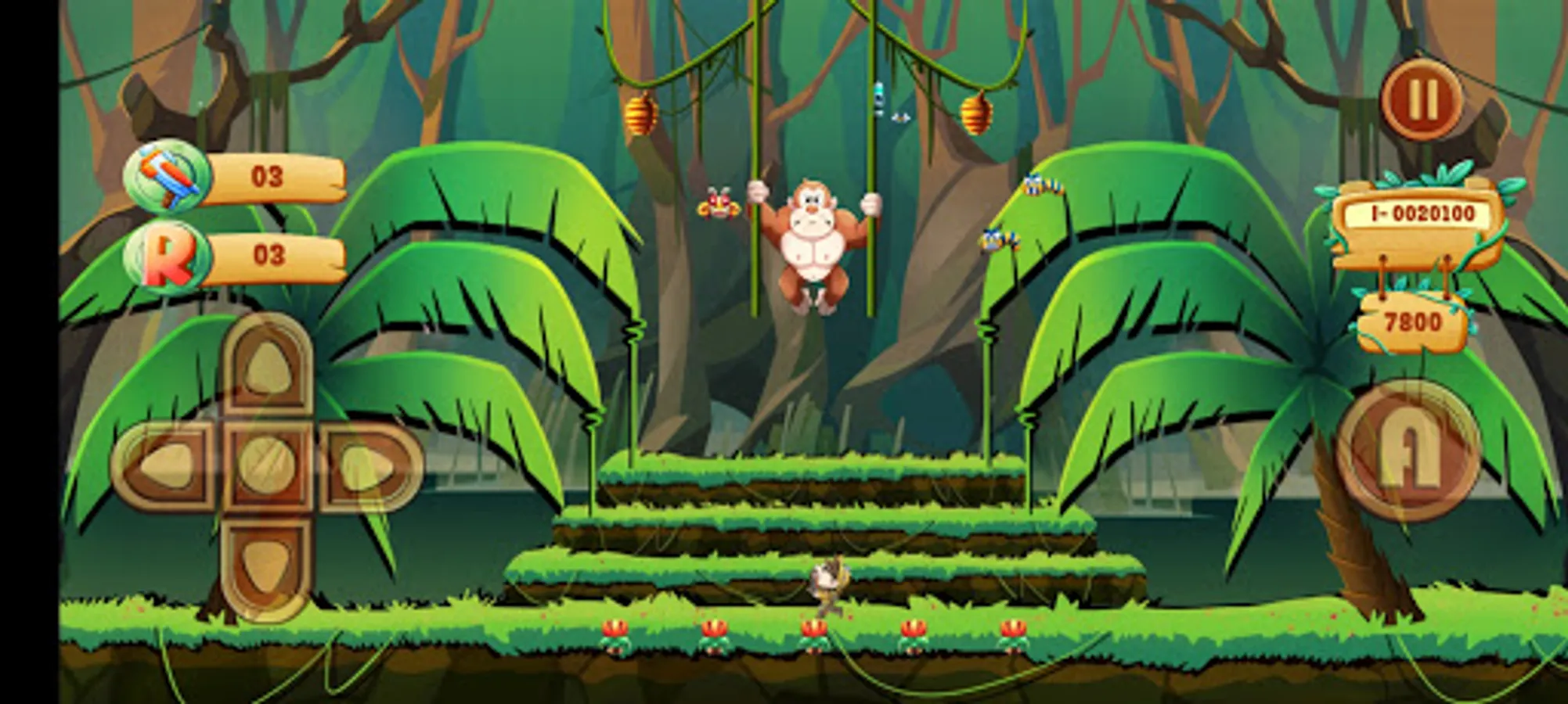 Crazy Kong hangs from vines at the center of the screen, and the player runs and jumps on platforms beneath him. Player can shot the Crazy Kong and the insects by his gun. Player shot on the Crazy Kong, forcing him to the top of the screen and the level is completed.