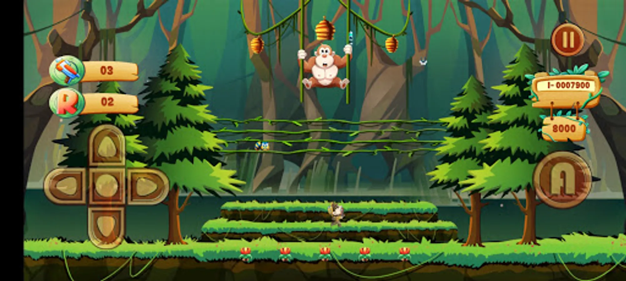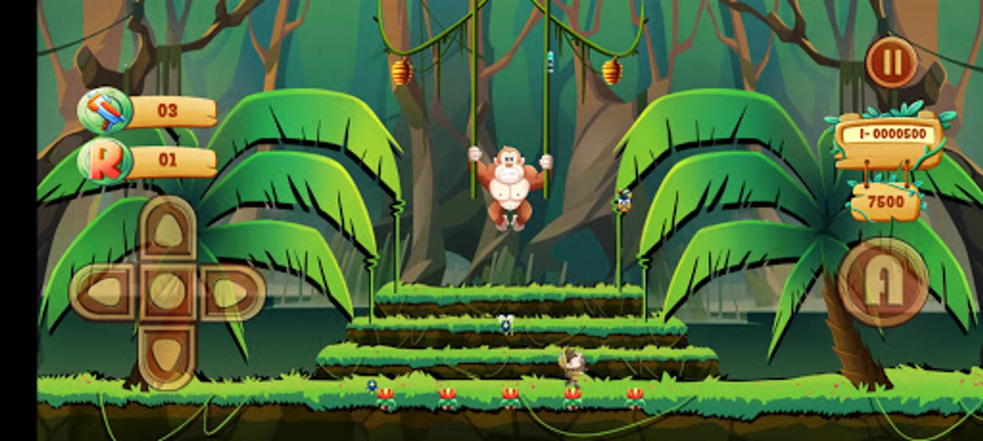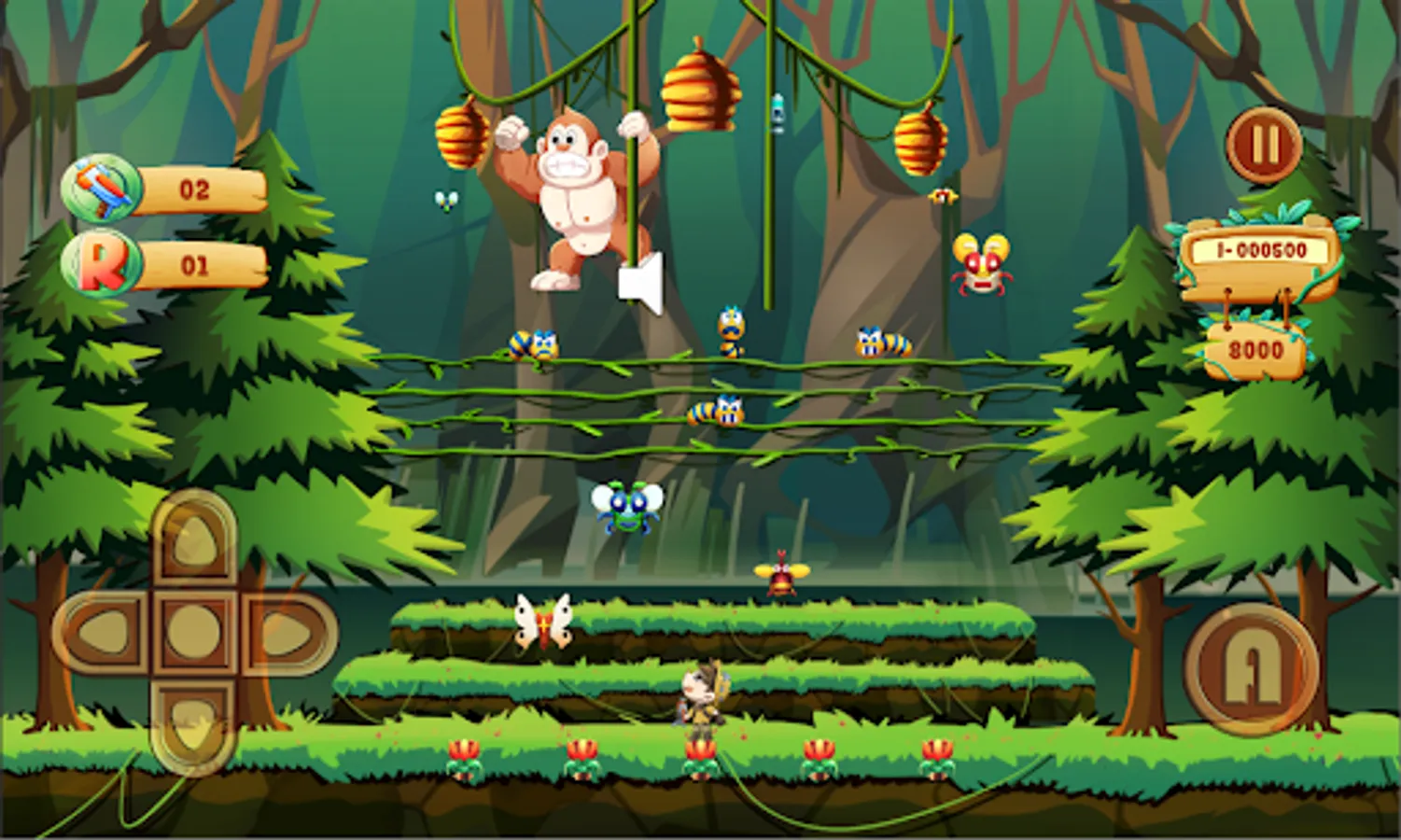 Crazy Kong hangs from vines at the center of the screen, and the player runs and jumps on platforms beneath him. Player can shot the Crazy Kong and the insects by his gun. Player shot on the Crazy Kong, forcing him to the top of the screen and the level is completed.