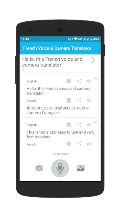 -> French Voice & Camera Translator application can also be converted from one language to another by gallery, camera and your voice.