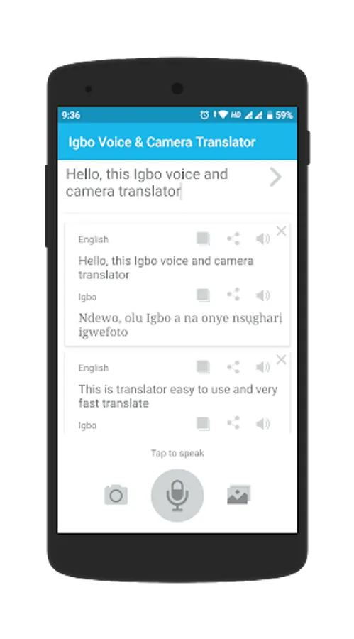 -> Igbo Voice & Camera Translator is the only application where you can convert from one language to another by simultaneous camera, voice and text.