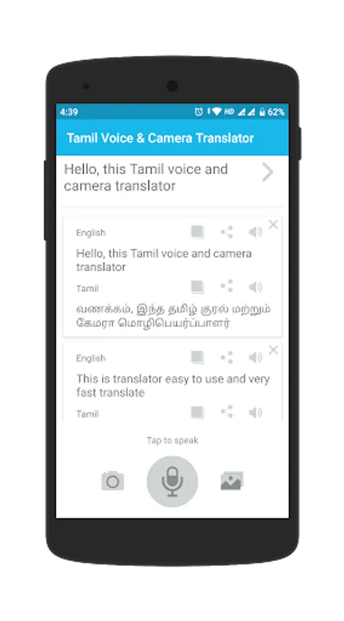 -> Tamil Voice & Camera Translator application can also be converted from one language to another by gallery, camera and your voice.