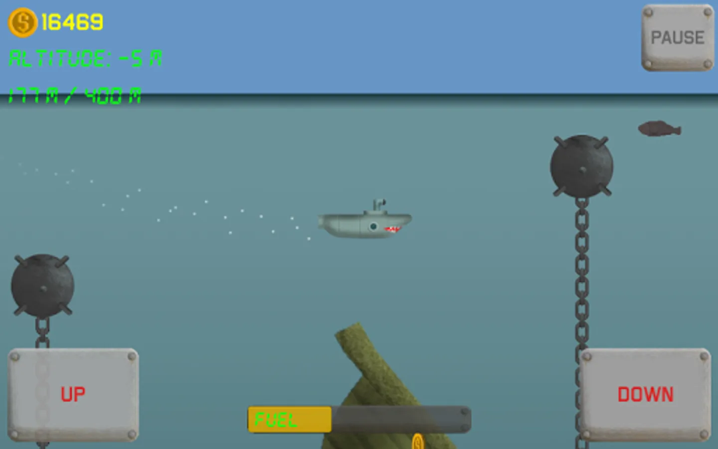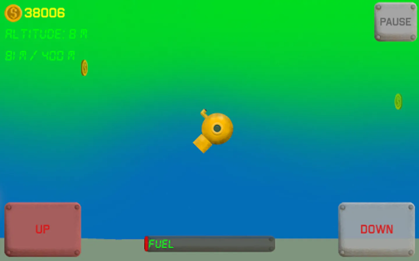 Use your flying submarine to collect gold and gems. Watch out for mines, boats, planes and aliens. There are a variety of vehicles to use and levels to play. See how far you can get without crashing and how many points you can get. You can use those points to buy new vehicles, levels and upgrades for you vehicles.
