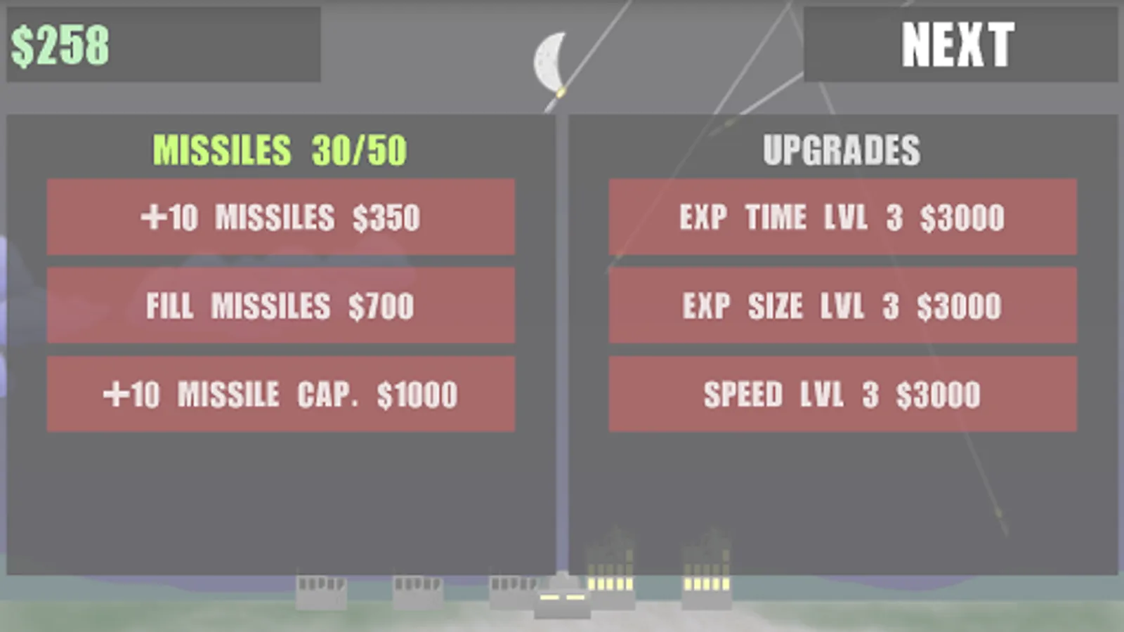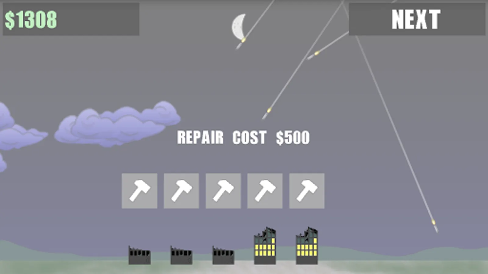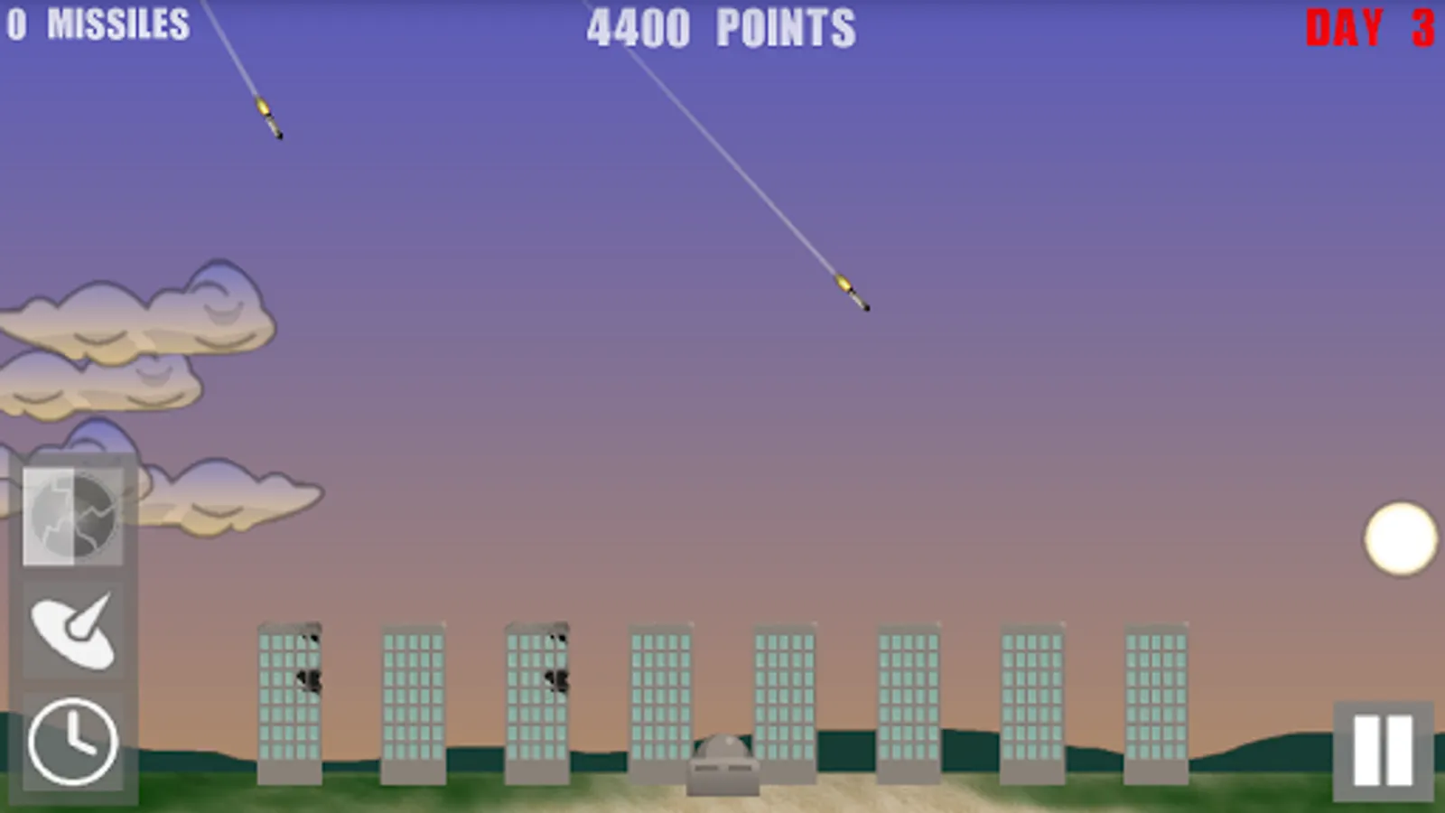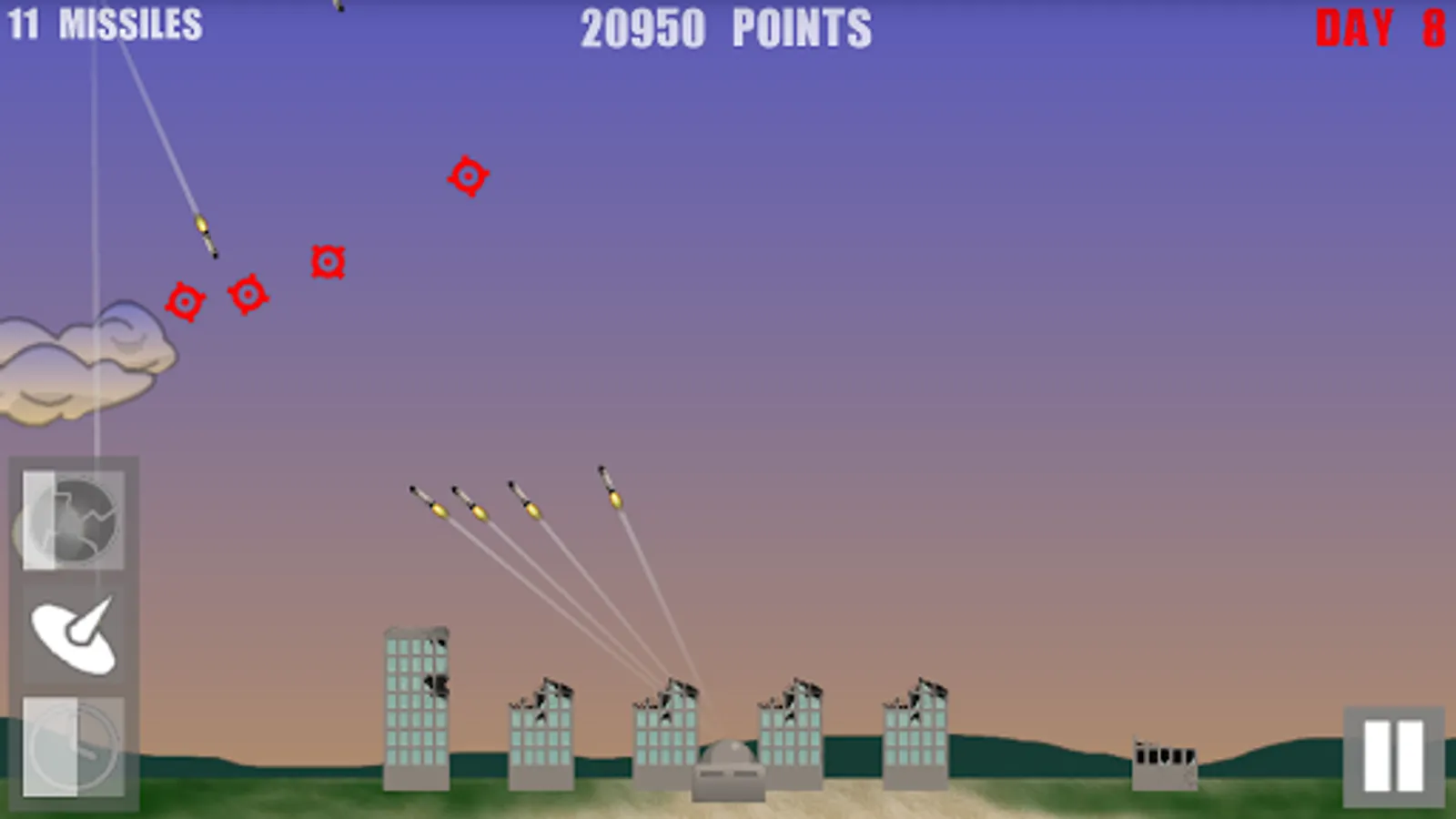 Intercept enemy missiles by tapping the screen to fire missiles at them. Be sure to pay attention to your missile count, if you run out of missiles you will be defenseless until you buy more. When your buildings are damaged you can repair them, unless they are completely demolished. Each day you will be given an opportunity to upgrade, and buy more missiles.