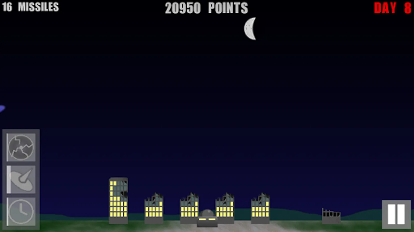 Defend your city from a barrage of enemy missiles. Use your missiles, lasers, EMP, and skills to save your people from the missiles raining down from the sky. How many days can you survive?