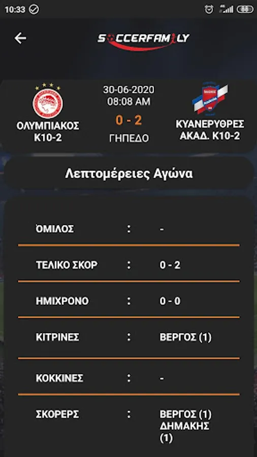 • The results of the academy’s team matches (with final scores, half-time scores, scorers, yellow and red cards etc.).