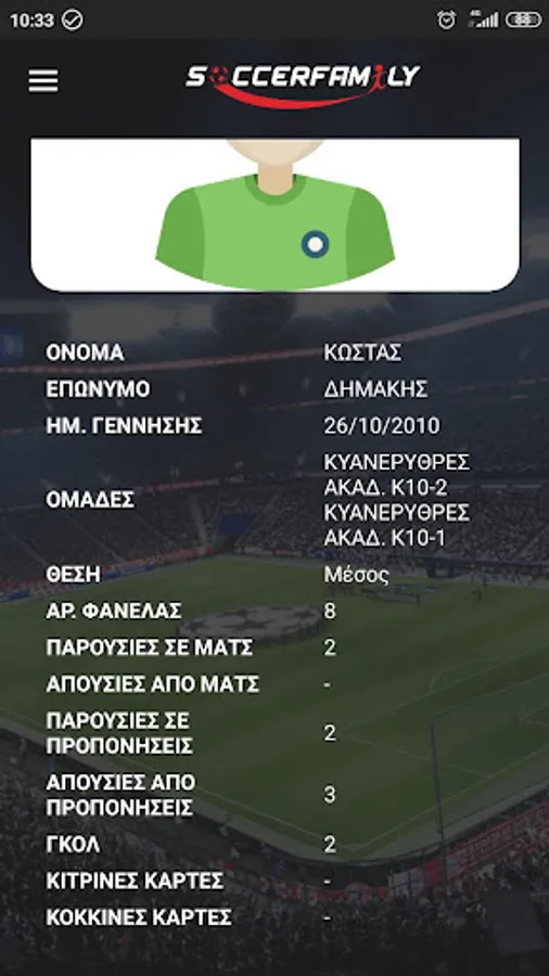 • Statistics player data such as matches participations, training participations, total goals, total yellow and red cards, matches absents and matches presences.