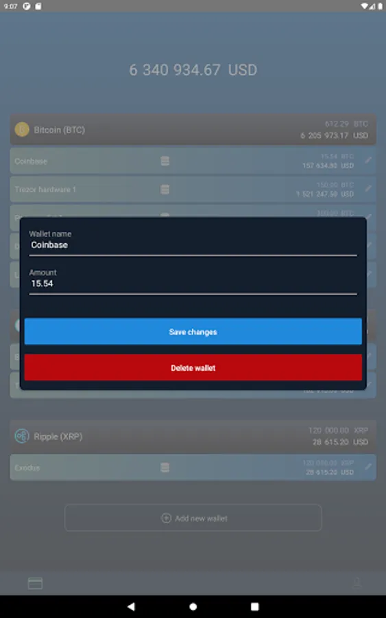 - balance of each crypto wallet you have -> coins and fiat equivalent