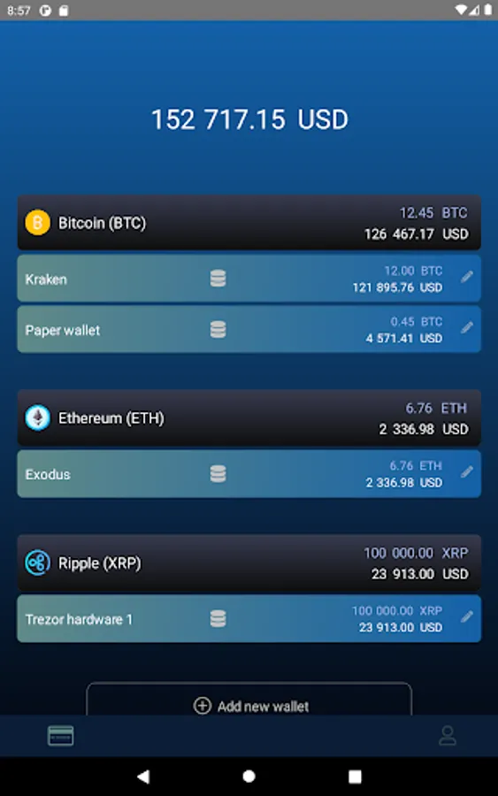 Crypto Wallet Integrator (CWI) gives you possibility to see total balance of each cryptocurrency wallet you have in one place no matter of its type: crypto exchange balance, hardware wallet, mobile or desktop wallet and even paper wallet.