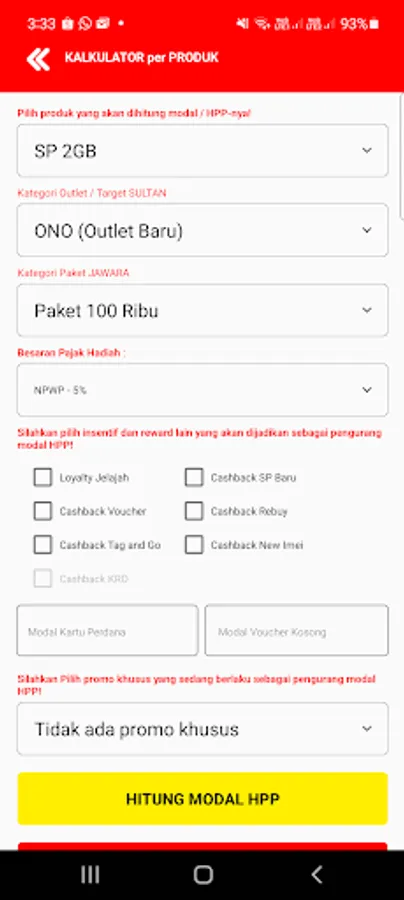 Android application to assist outlets in determining HPP for IM3 Indosat Ooredoo Hutchison products from various cashback and upfront discount programs