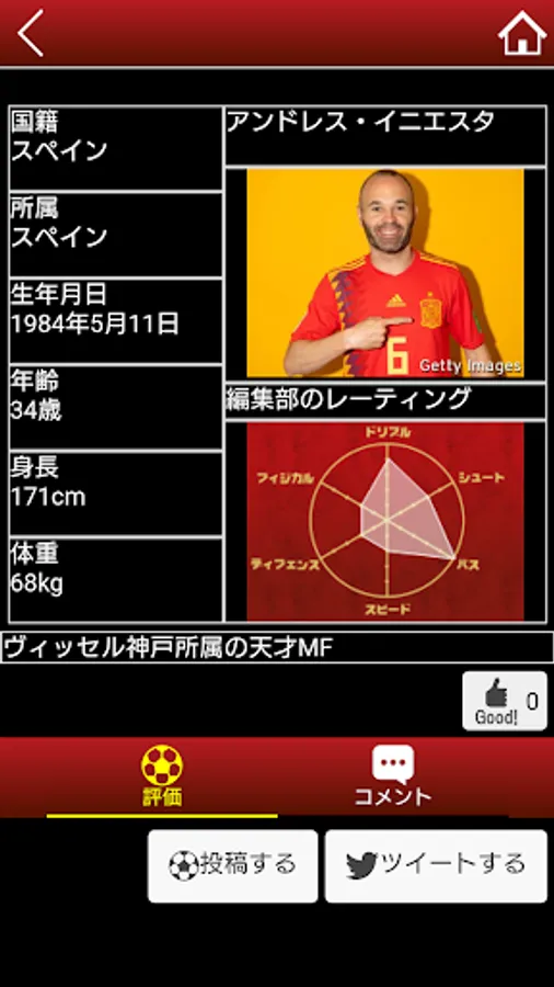 Dribble of each player, evaluate the ability of such shoot in the "ultra-WORLD soccer! Editorial department" radar chart. Users also its own evaluation, can also be posted.