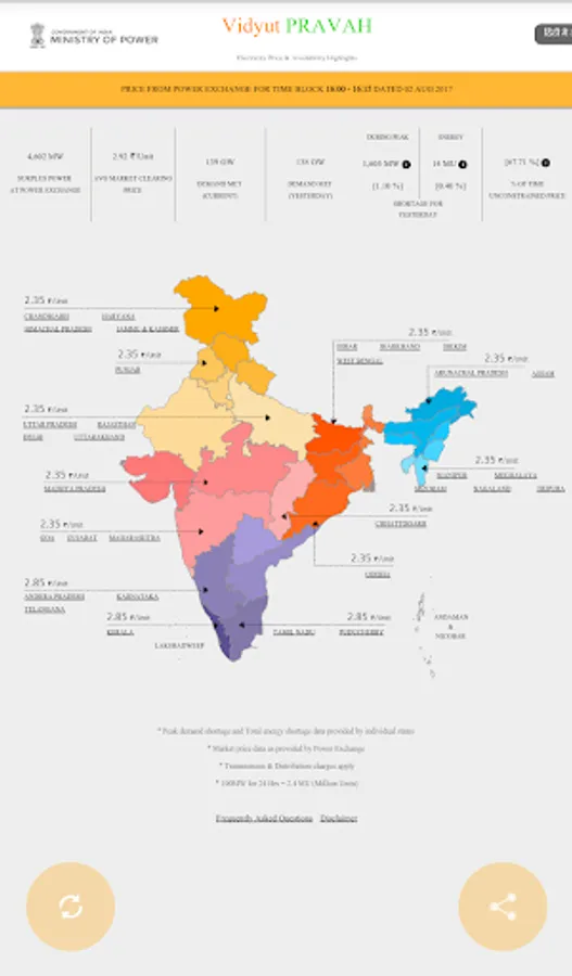 A user friendly interface, based on the Geographical map of India, facilitates all the consumers /stakeholders in visualization of the power availability and prices at the overall country level and at States/UTs level. The information disseminated through the Application will empower the consumer, thereby leading all the stakeholders to be more responsive and efficient, bringing more economy to the country.